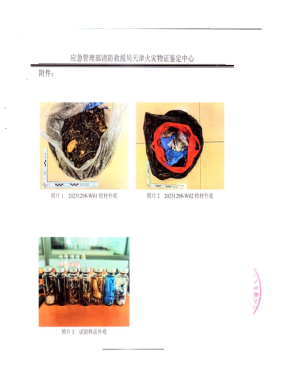 事发时,起火建筑部分预处理间用作暂存库,存储大量有机加工、汽车制造、医药、化工等行业产生的危废物料。依据视频监控显示,起火部位位于2号生产厂房成品转运区通道东南侧距1#楼梯口15.5米处(见图一),起火点存放1个吨桶,吨桶内存有经细破后的沾染污染物的各色织物、薄膜、纤维颗粒,颗粒直径为30~50mm。根据《应急管理部消防救援局天津火灾物证鉴定中心检验报告》(见图1),预处理车间储存的危废物具有自燃特性。