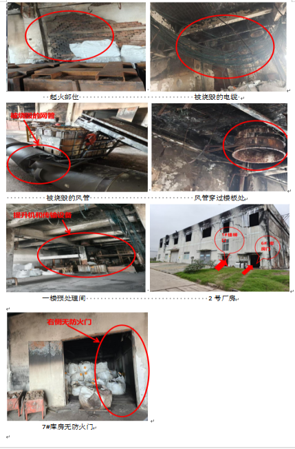 结合应急管理部消防救援局天津火灾物证鉴定中心检验报告(图2)及相关人员笔录,事故调查组一致认为,该事故的直接原因系:众思润禾公司在预处理车间成品转运区通道东南侧、距1#楼梯口15.5米处存放一个吨桶,吨桶内储存的沾染油类、漆类、有机溶剂等可燃性危险化学品的各色织物、薄膜、纤维经破碎后的颗粒物,因夏季高温、高湿天气,30-50mm的颗粒状危废物料堆积过程中积热不散,引发自燃,引燃厂房内存储的大量可燃、易燃危废物料,加之提升机井道、建筑的防火阀未动作、防火门缺失、孔洞未封堵,且消防控制室值守人员擅离职守导致初期火情未及时处置,造成火势蔓延,过火面积940m2。