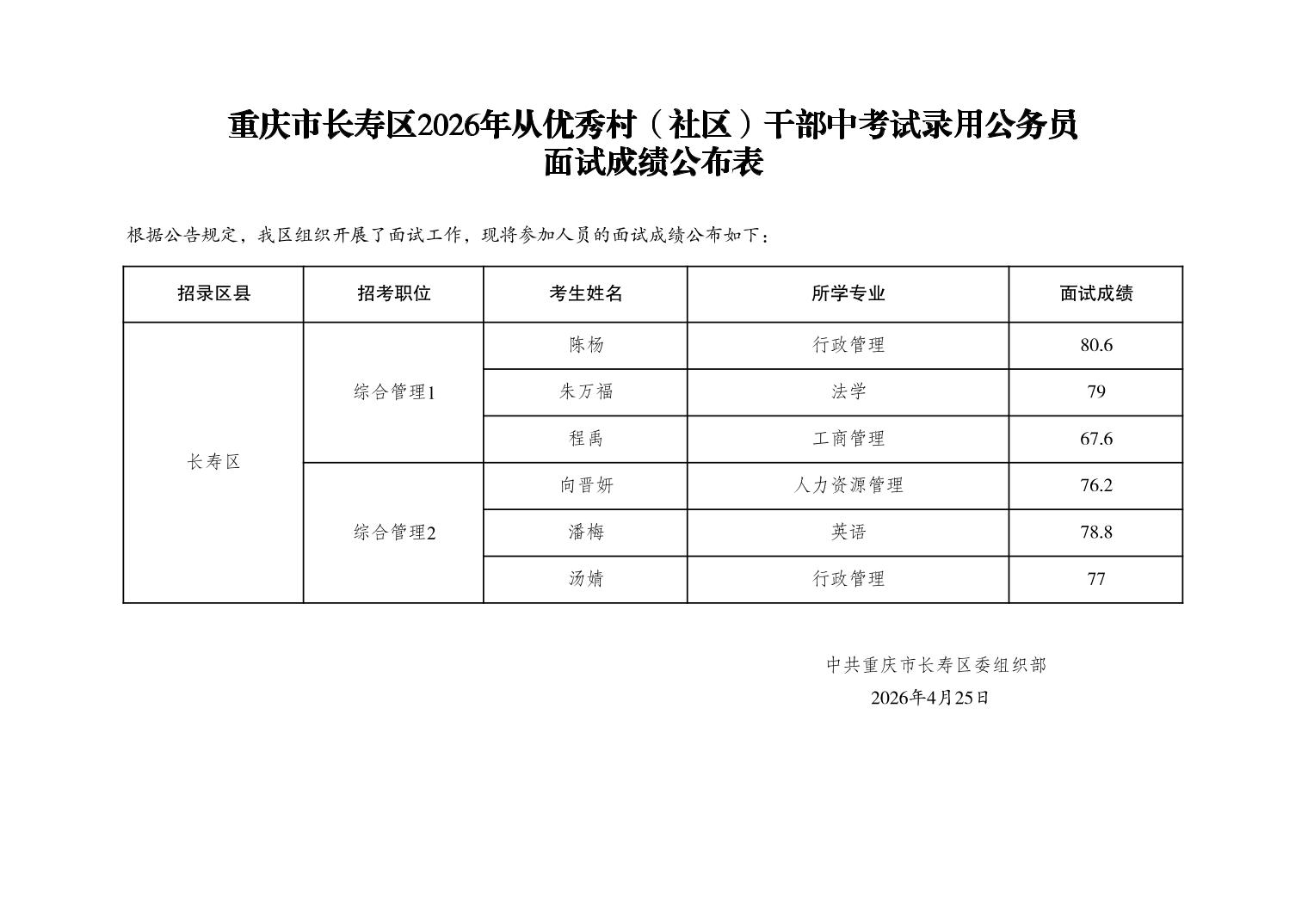 重庆市长寿区2026年从优秀村(社区)干部中考试录用公务员面试成绩公布表