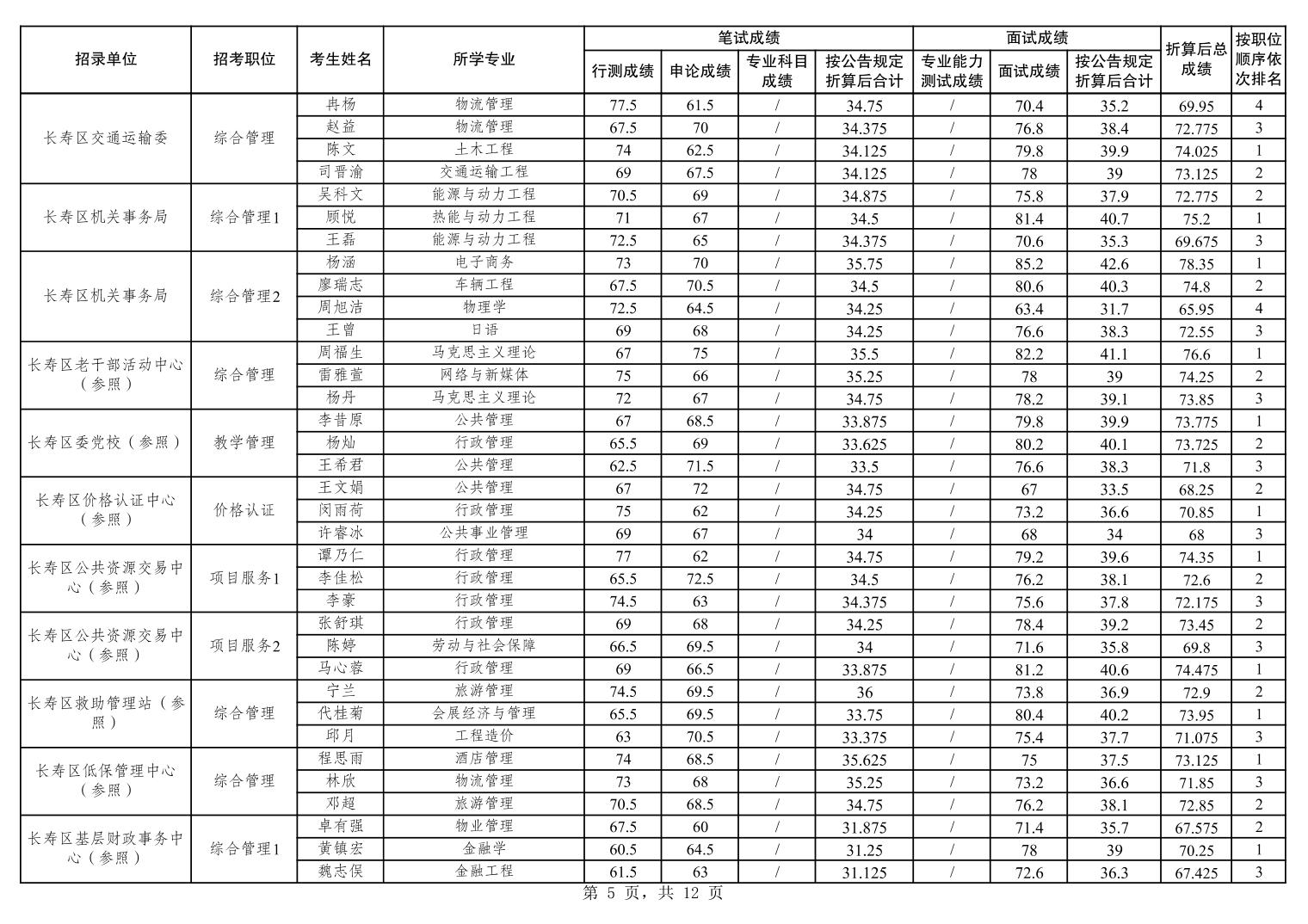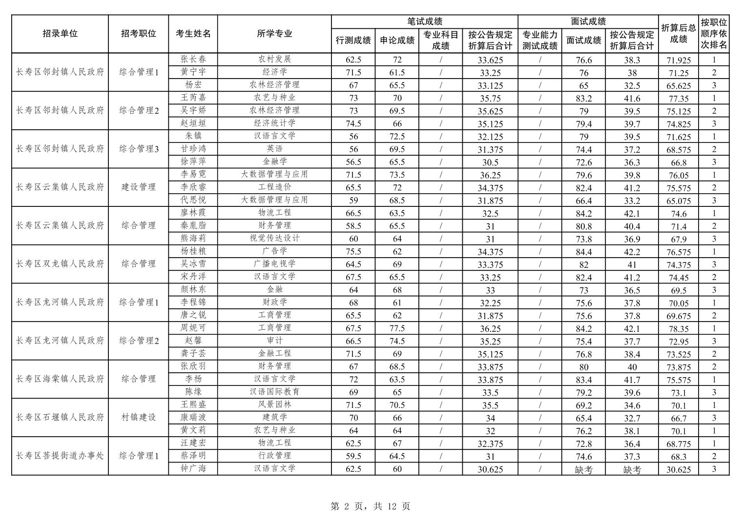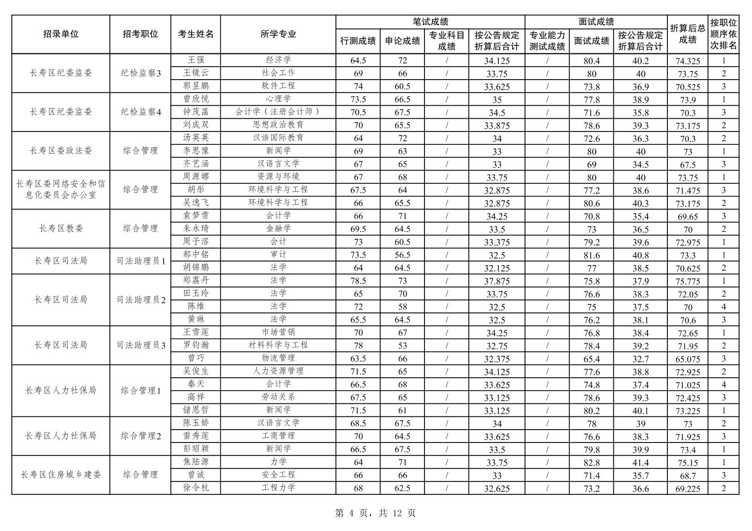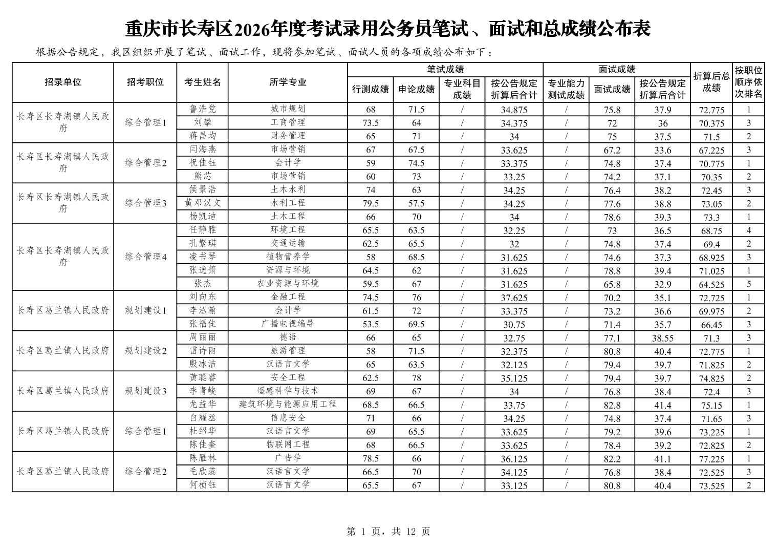 重庆市长寿区2026年度考试录用公务员笔试、面试和总成绩公布表