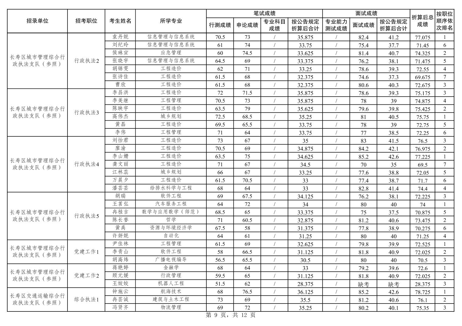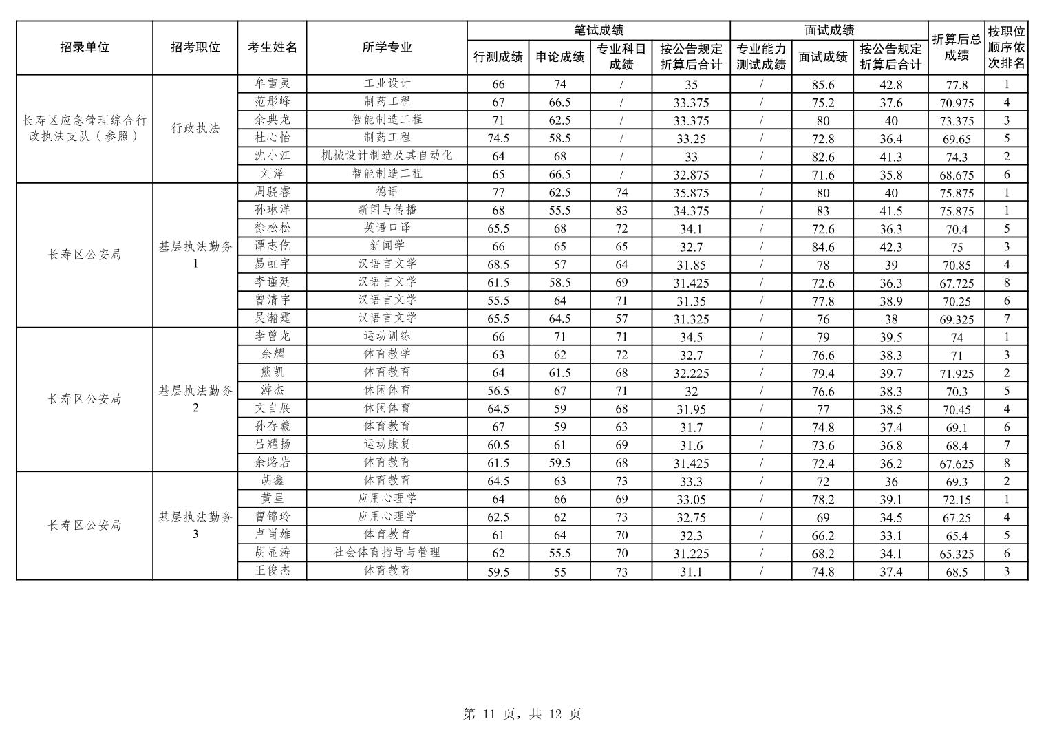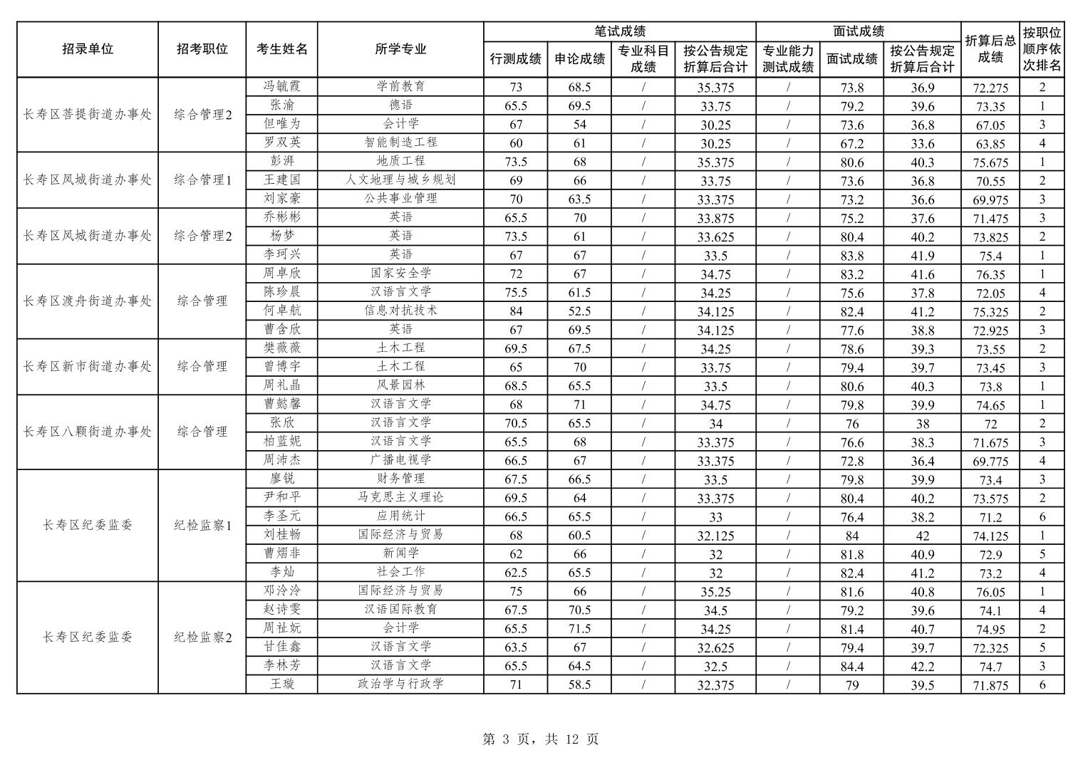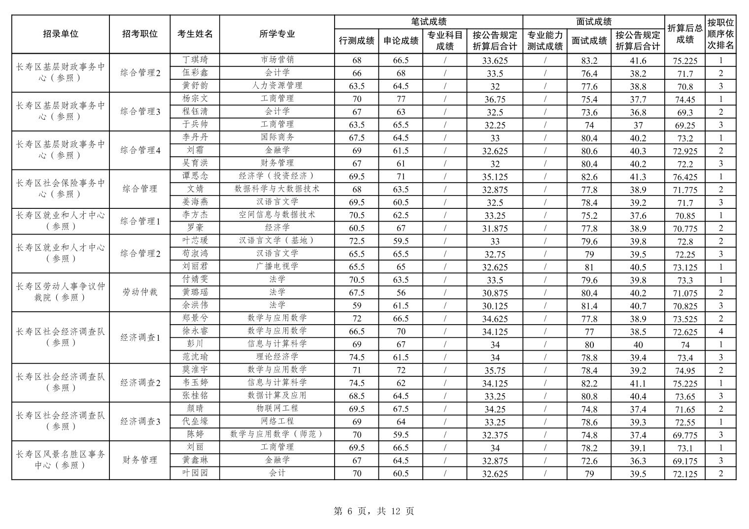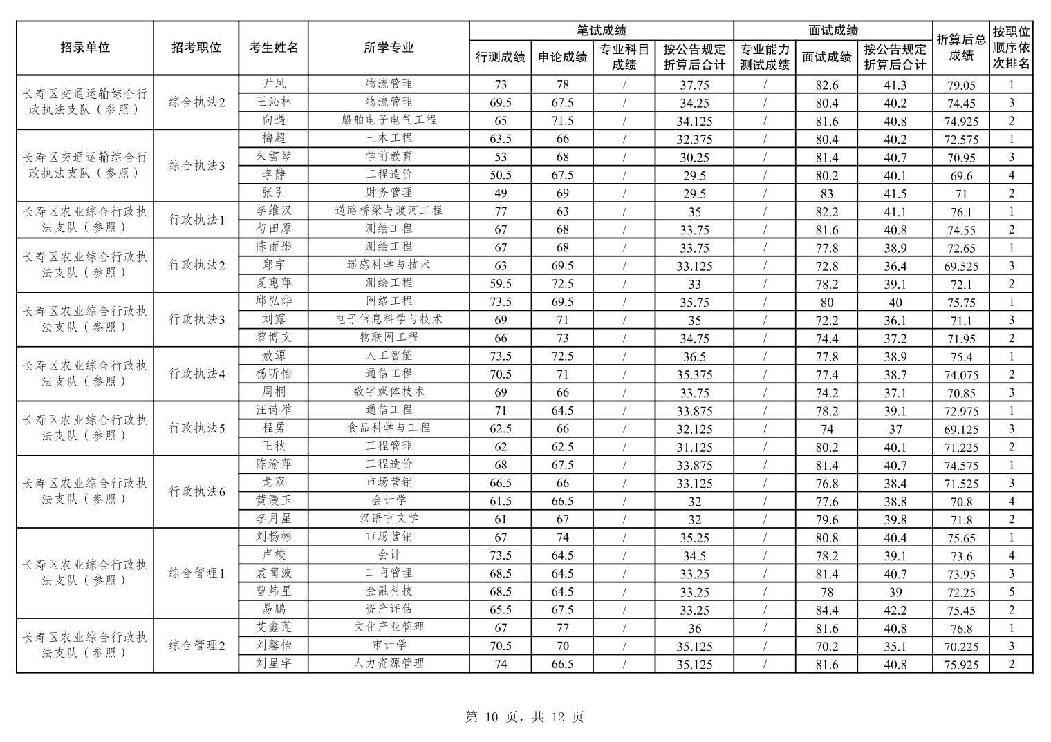 重庆市长寿区2026年度考试录用公务员笔试、面试和总成绩公布表