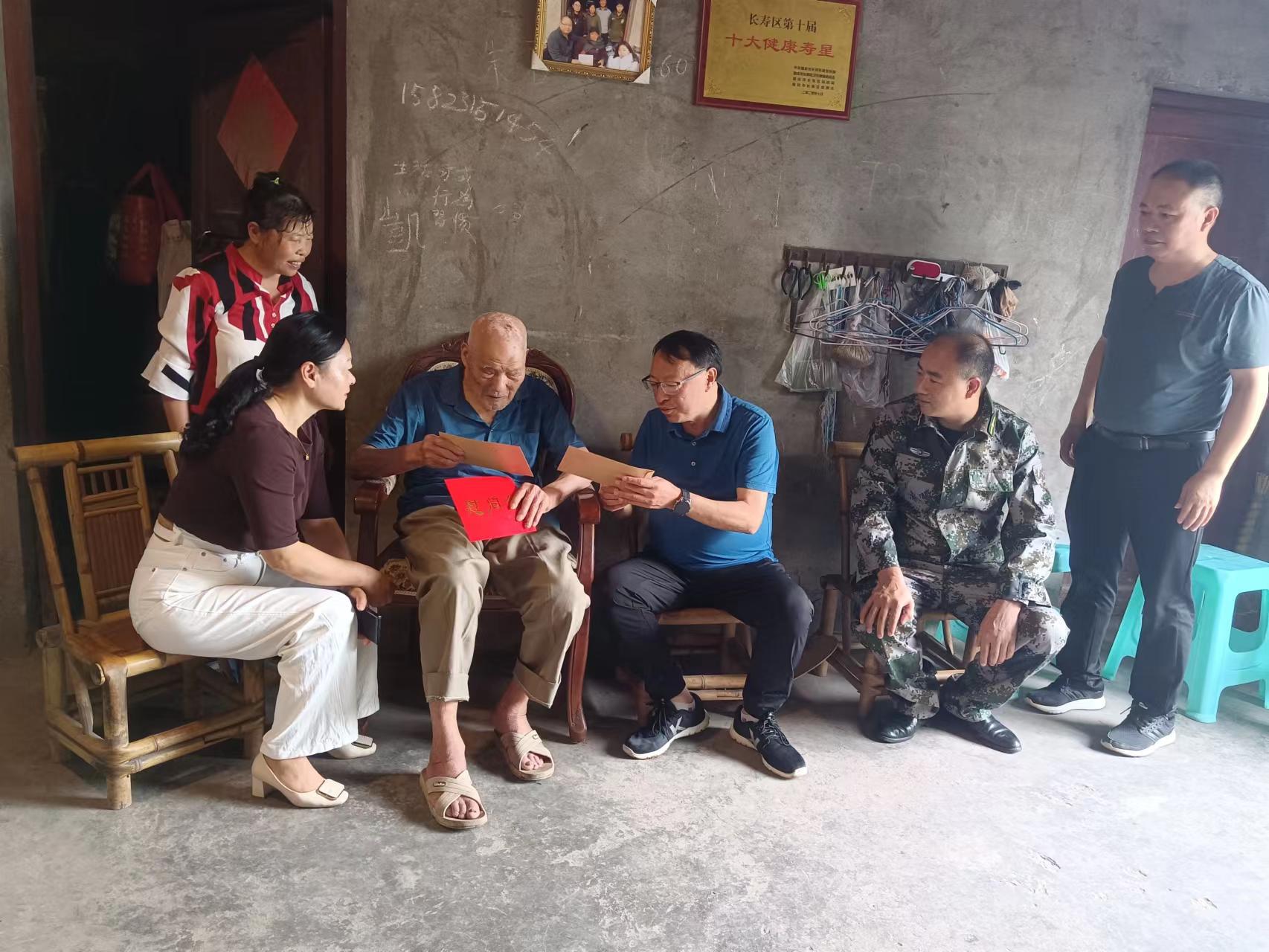 一行人与朱贵银亲切交谈,听他讲述战场的枪林弹雨,与他重温峥嵘岁月,并了解到他近期的身体状况、经济收入、家庭成员等基本情况,感谢他过去为国家作出的贡献,同时也嘱咐他保重身体,注意防暑。(朱贵银今年98岁高龄,曾参加过抗美援朝战役,在渡江战役中荣立战时三等功1次;舟山战役中荣立四等功1次;在闽北修建中荣立三等功1次,新兵工作中荣立二等功1次。)