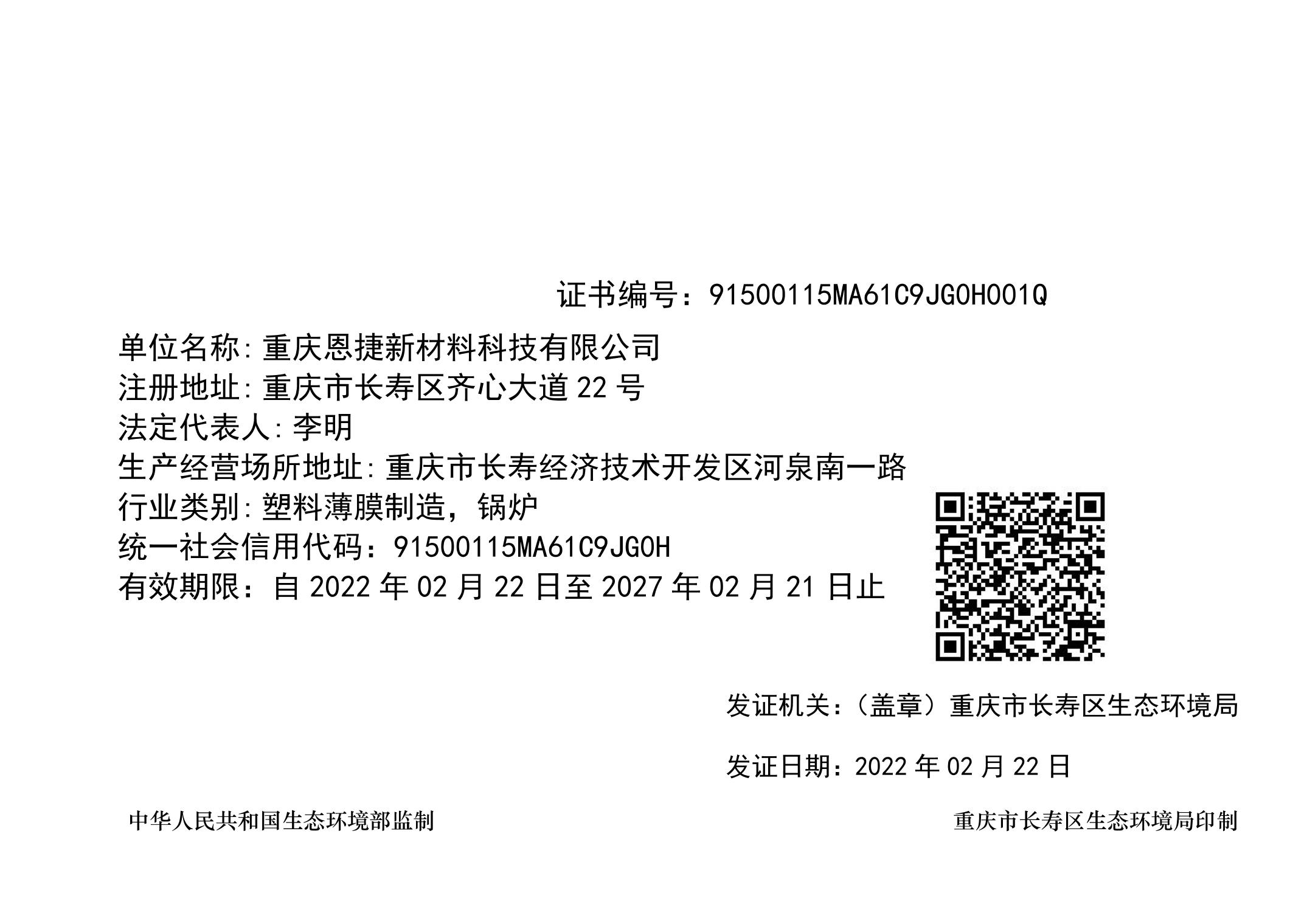 重庆恩捷新材料科技有限公司排污许可证
