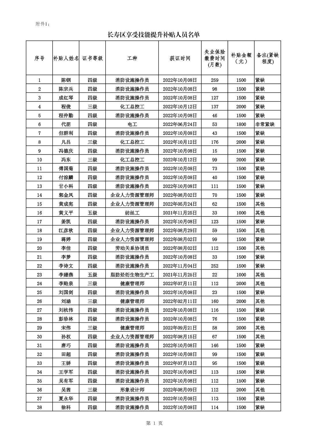 根据重庆市人力社保局、财政局《关于失业保险支持参保职工提升职业技能有关问题的通知》(渝人社发〔2017〕165号)文件规定,经审核,拟同意给予陈钢等51名同志发放职业技能提升补贴,现予以公示(名单见附件),公示期为5个工作日(2022年12月15日—2022年12月21日)。