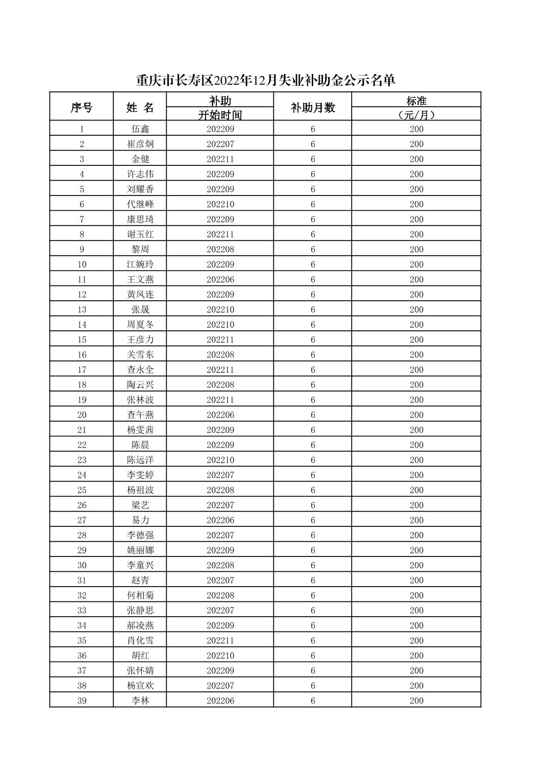 重庆市长寿区2022年12月领取失业补助金人员公示