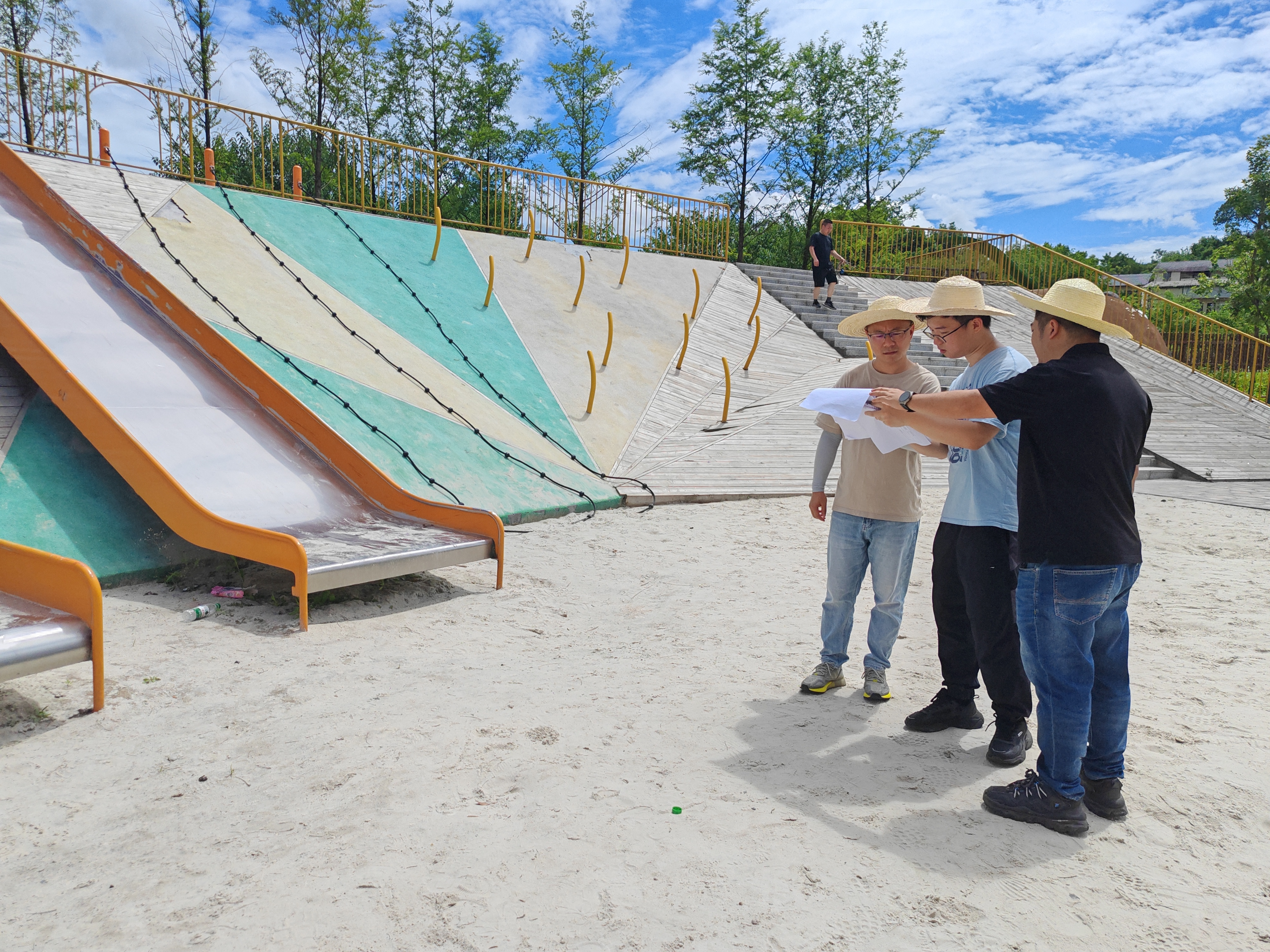 近日,长寿区审计局联合建设、施工单位走进慢城无动力乐园,对儿童游乐区高空网、滑梯、沙地等关键设施进行重点检查,排查结构牢固度、防护网完整性、地面缓冲层厚度及安全标识设置,同步抽检设备维保记录与应急预案,压实主体责任,消除隐患,守护儿童“脚下安全”,让市民放心“遛娃”。图为审计人员实地检查游乐设施。