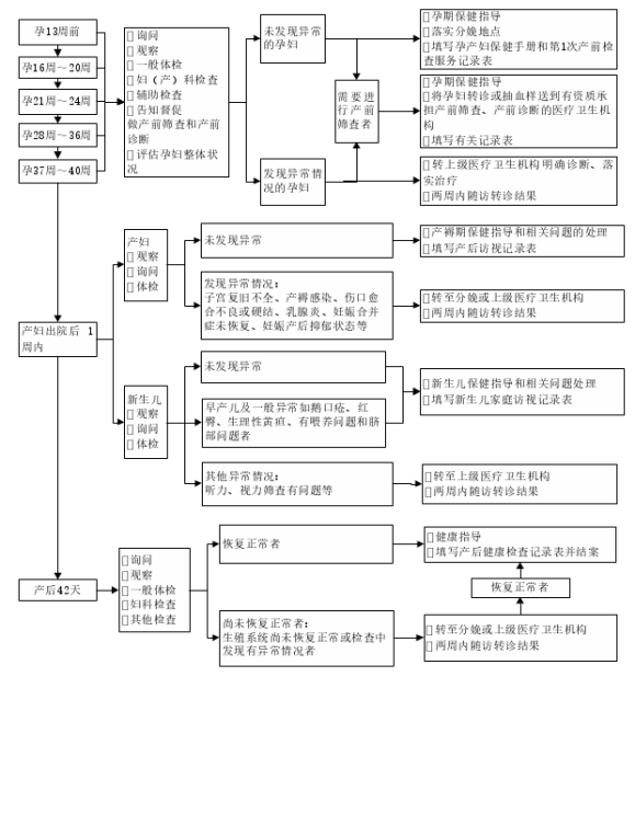 (2)孕妇健康状况评估:通过询问、观察、一般体格检查、产科检查、实验室检查对孕妇健康和胎儿的生长发育状况进行评估,识别需要做产前诊断和需要转诊的高危重点孕妇。