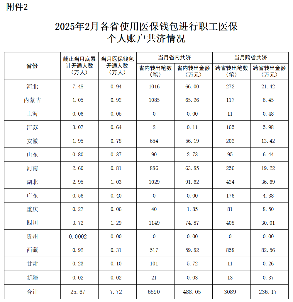 2025年2月,通过医保钱包转账方式进行职工医保个人账户省内、跨省共济共9679笔,转账金额724.22万元。从共济地域看,省内转账6590笔,转账金额488.05万元;跨省转账3089笔,转账金额236.17万元。从医保钱包使用用途看,支付就医购药费用总计2916笔,金额53.67万元;缴纳居民医保费用总计19笔,金额8506元。