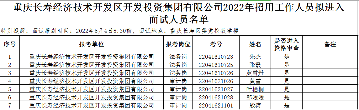 重庆长寿经济技术开发区开发投资集团有限公司2022年招用工作人员拟进入面试人员名单