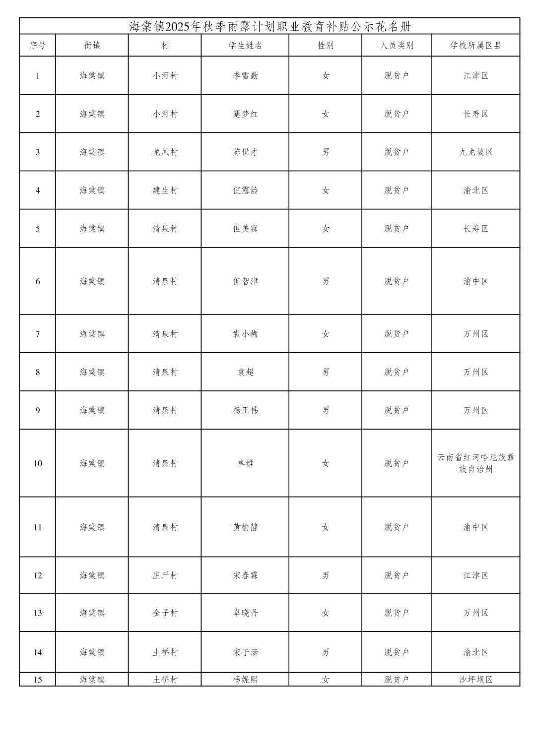 海棠镇2025年秋季雨露计划职业教育补贴公示花名册