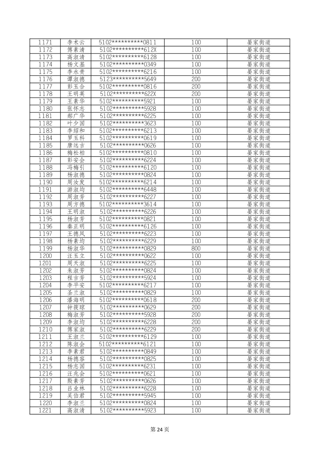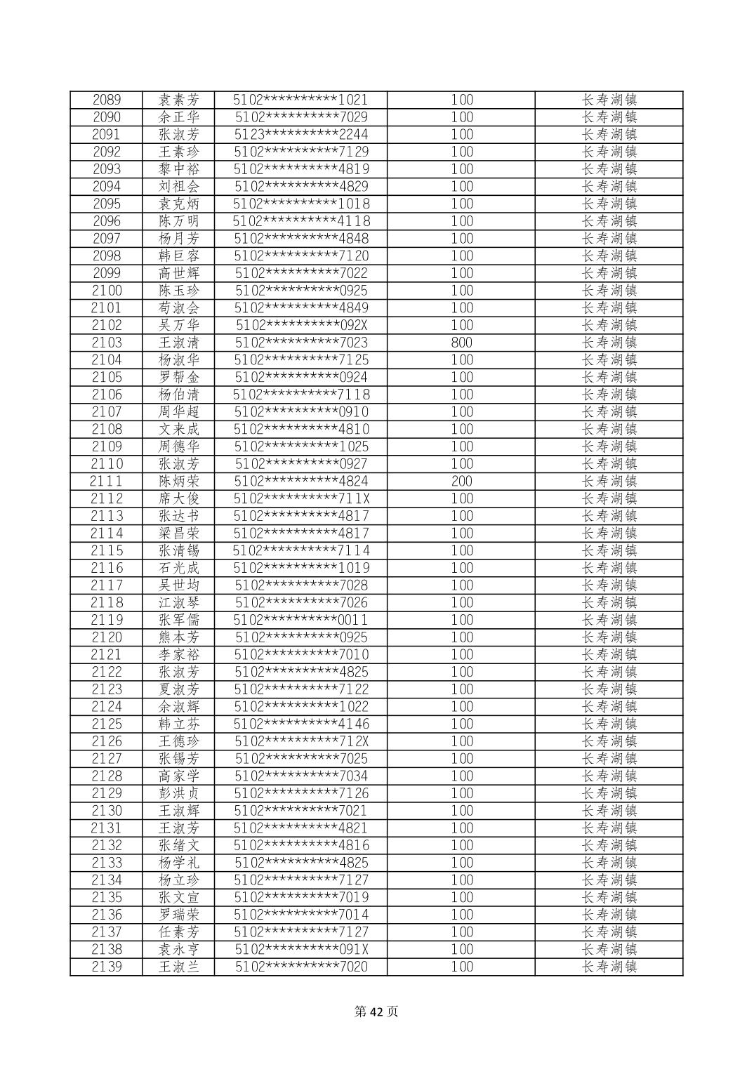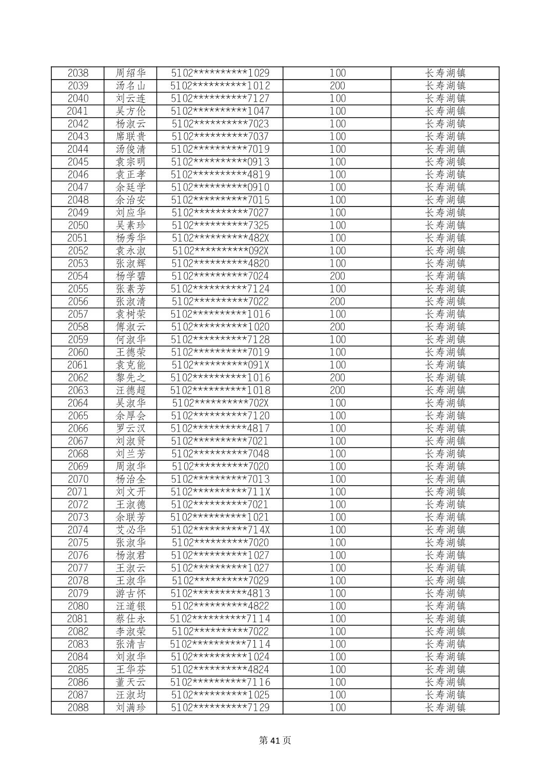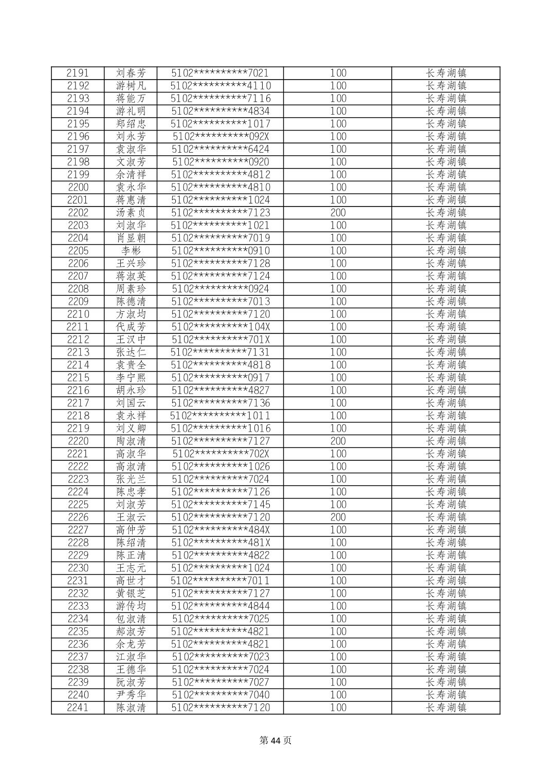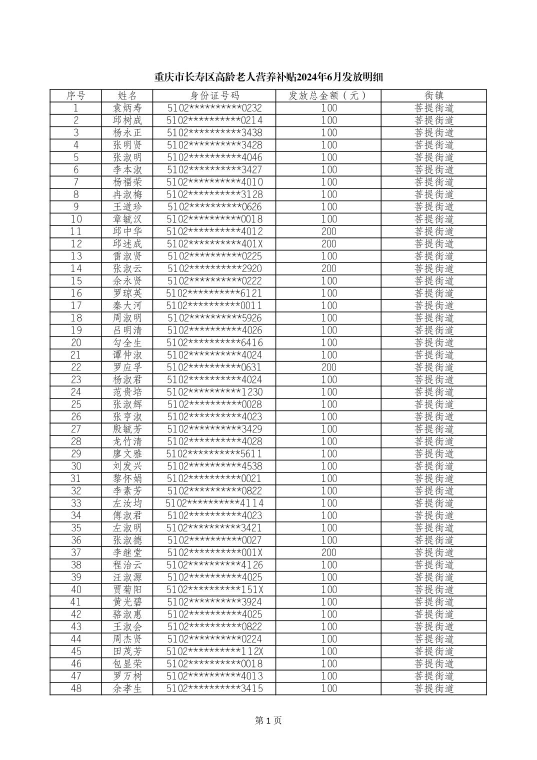 重庆市长寿区高龄老人营养补贴2024年6月发放明细