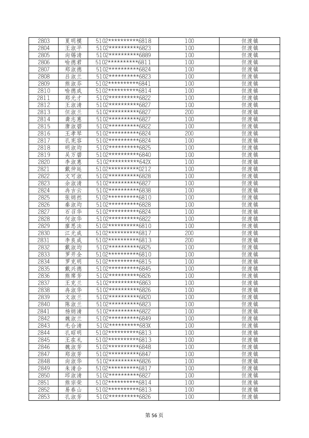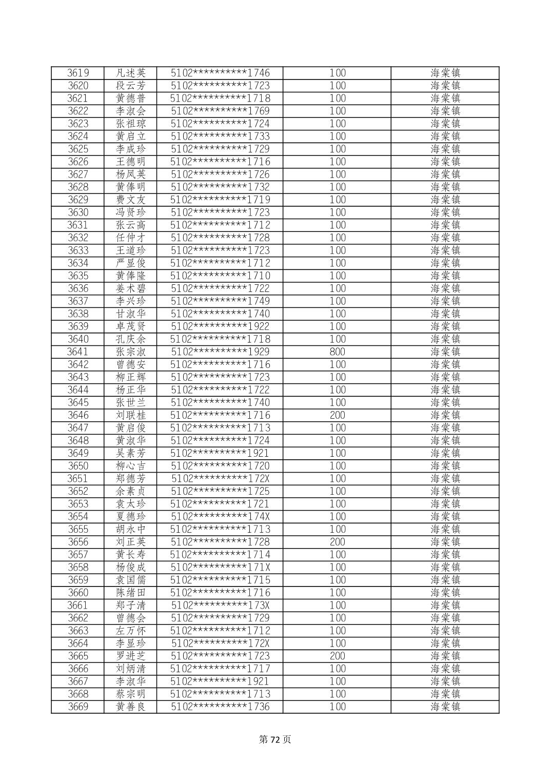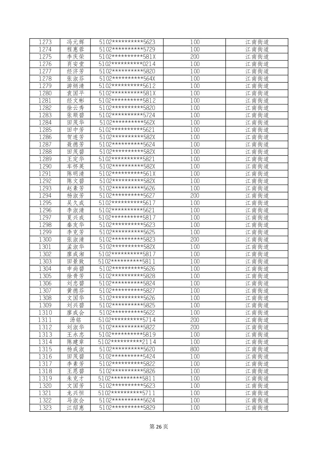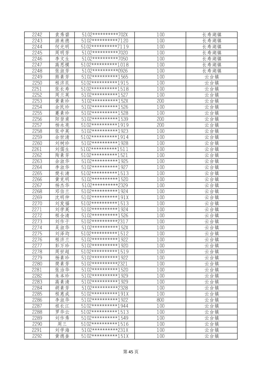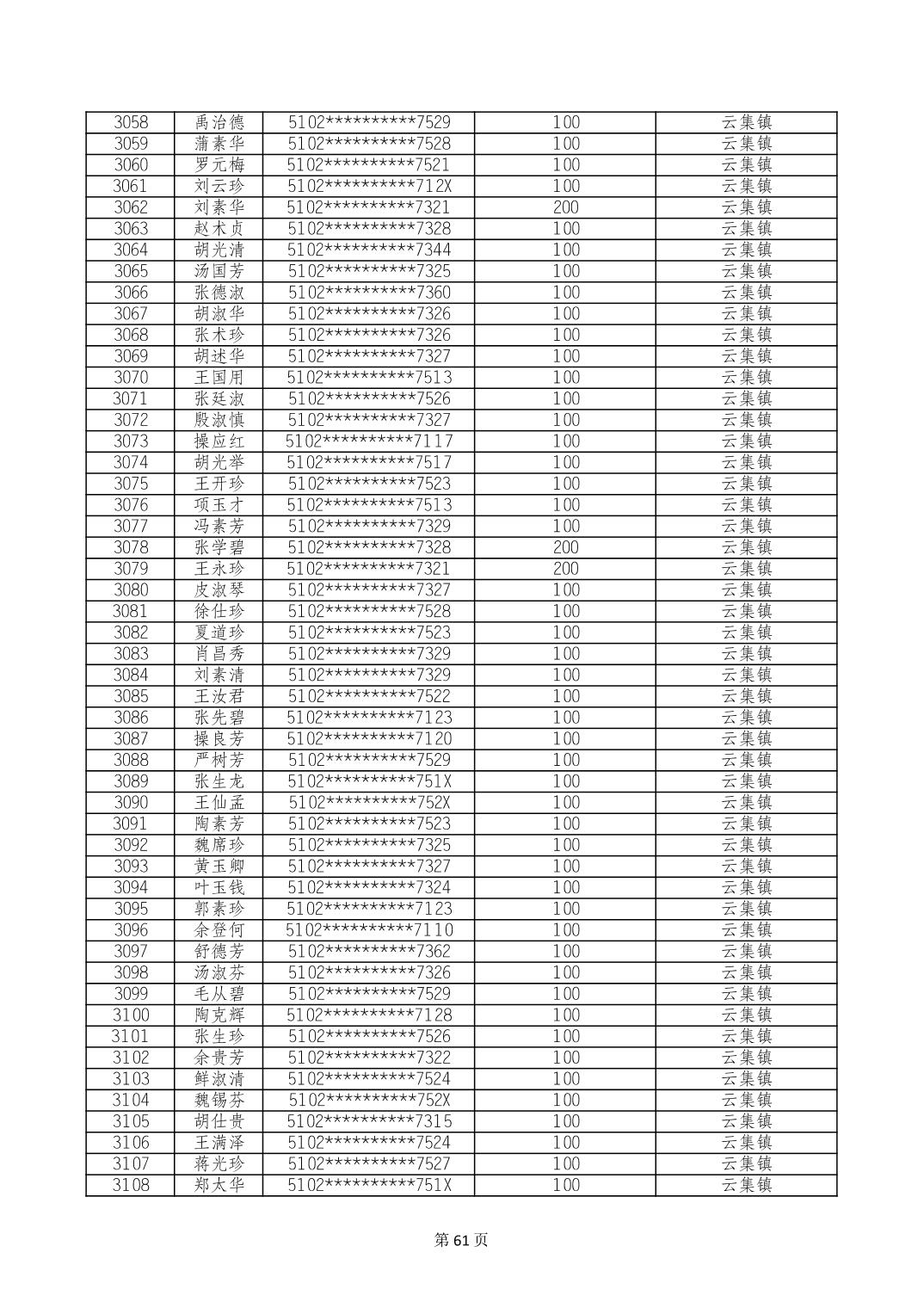 重庆市长寿区高龄老人营养补贴2024年6月发放明细