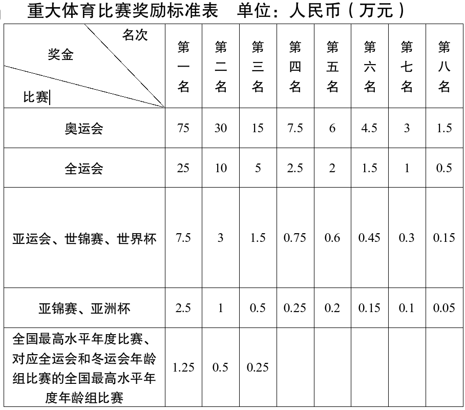 (1)运动员每获得一个名次按奖励标准计发奖励,兼项获得多个名次予以累计计发奖励。