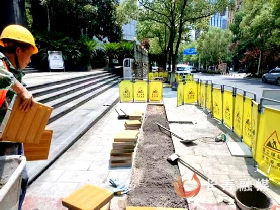 现场施工人员一边手持水平仪调试盲道口斜坡角度,一边向记者介绍道:“不规范的直角转弯都改成弧形,现在轮椅通行不会卡轮了。”