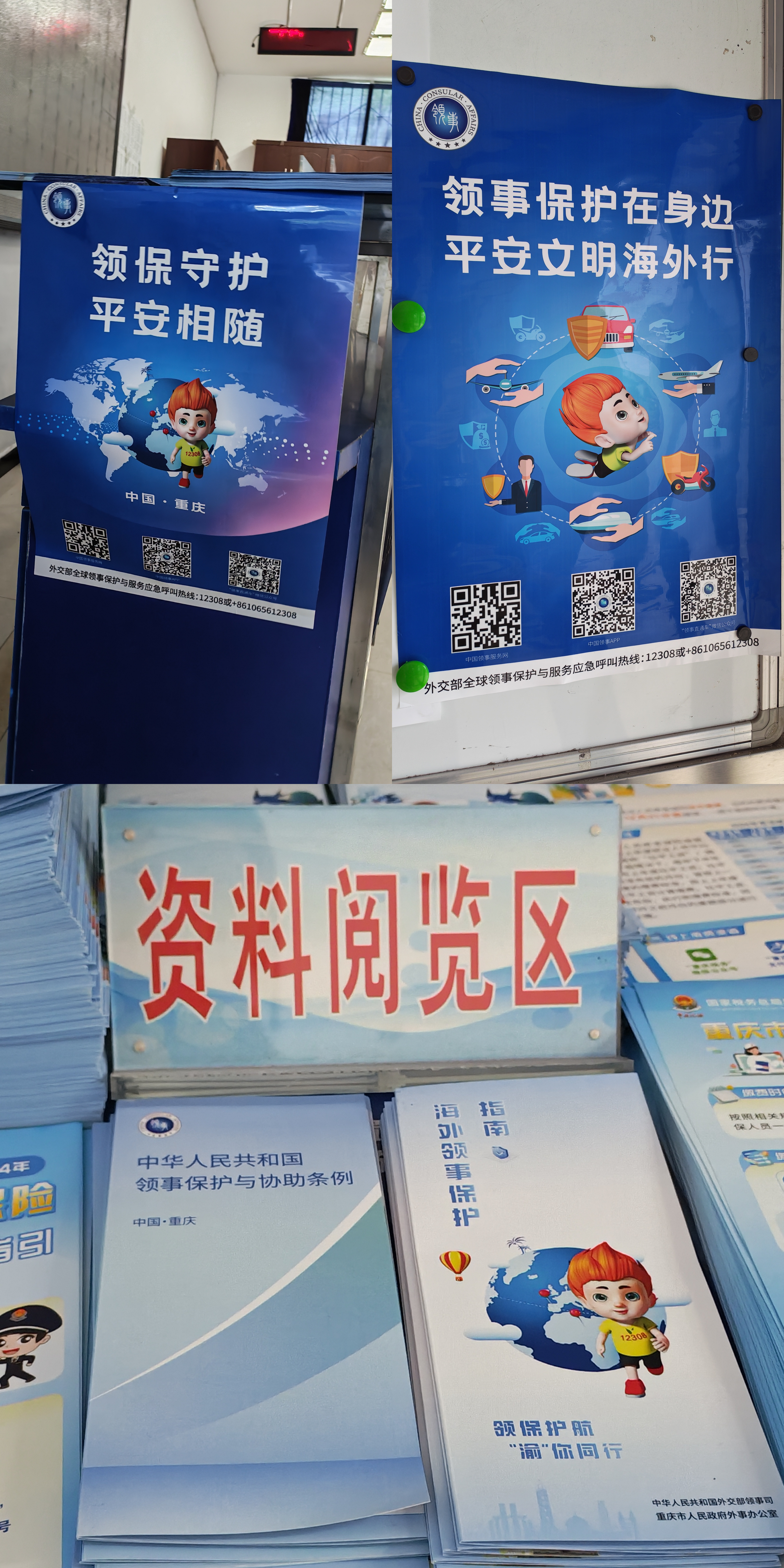 二是奏响“立体声”,线上线下联动。线上依托微信群组,持续推动领事保护相关知识、宣传视频、主题海报等。线下在镇政府办公楼、便民服务中心等场所张贴海报、摆放宣传折页,方便群众随时取阅;同时结合职工大会、院坝会等场合集中宣讲,并组织宣传队伍对重点人群上门走访,面对面讲解政策、答疑解惑,引导群众扫码关注“领事直通车”公众号。