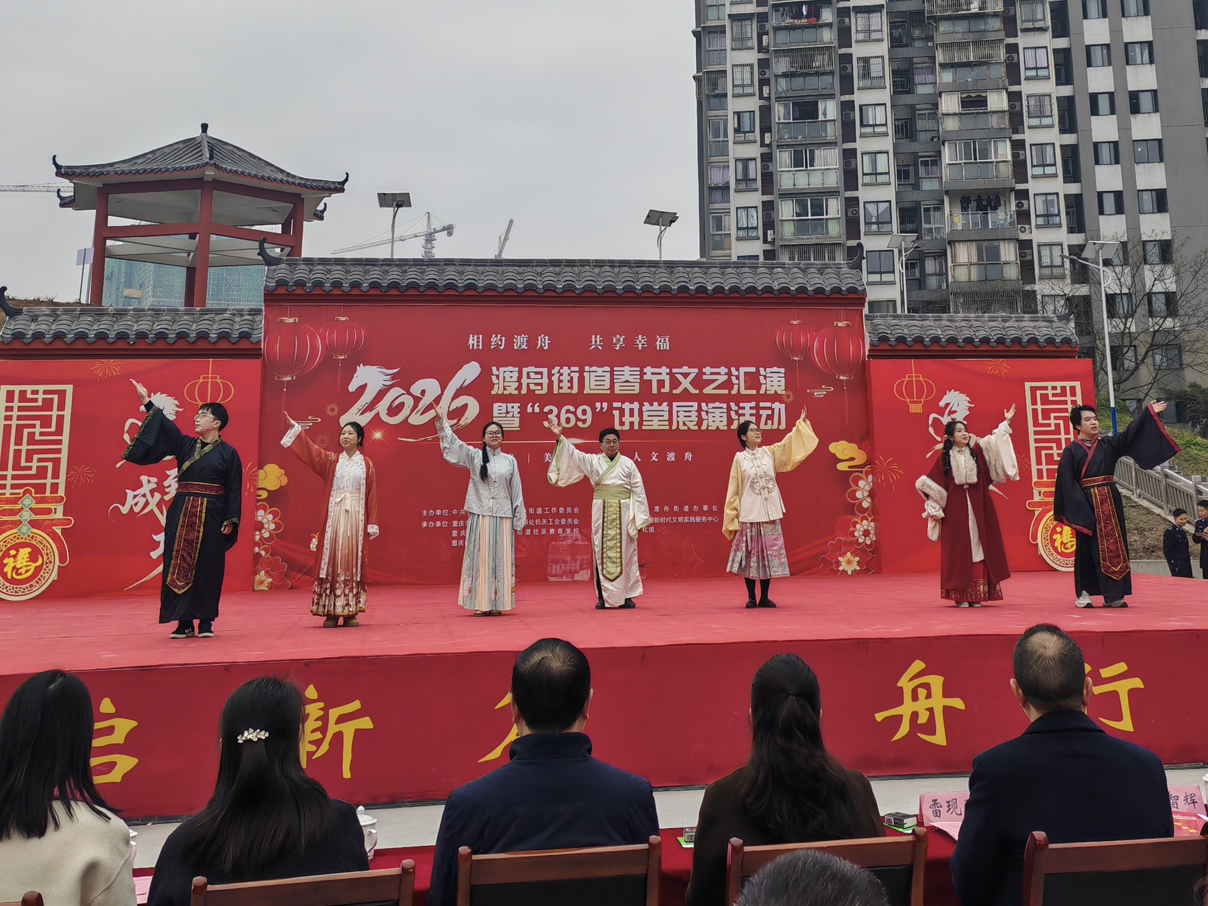 近日,渡舟街道隆重举办“相约渡舟 共享幸福”2026年春节文艺汇演暨“369”讲堂展演活动,生动展现了党建引领下各项事业的崭新进展与干群同心奋斗的蓬勃风貌。活动巧妙融合政策宣传、民生服务与文化展演,组织辖区场镇部门、单位和17个村(社区)组建演出联队,用情景剧、三句半等鲜活形式演绎医保惠民、反诈防骗、乡村振兴等贴近群众的主题,以朗朗上口的快板、深情激昂的诗朗诵宣讲理论政策,通过诙谐小品、活力说唱强化安全宣传教育。现场穿插互动知识问答环节,并同步开展书画展览、送春联等暖心活动,为“十五五”开局之年营造出昂扬向上、喜庆祥和的社会氛围。