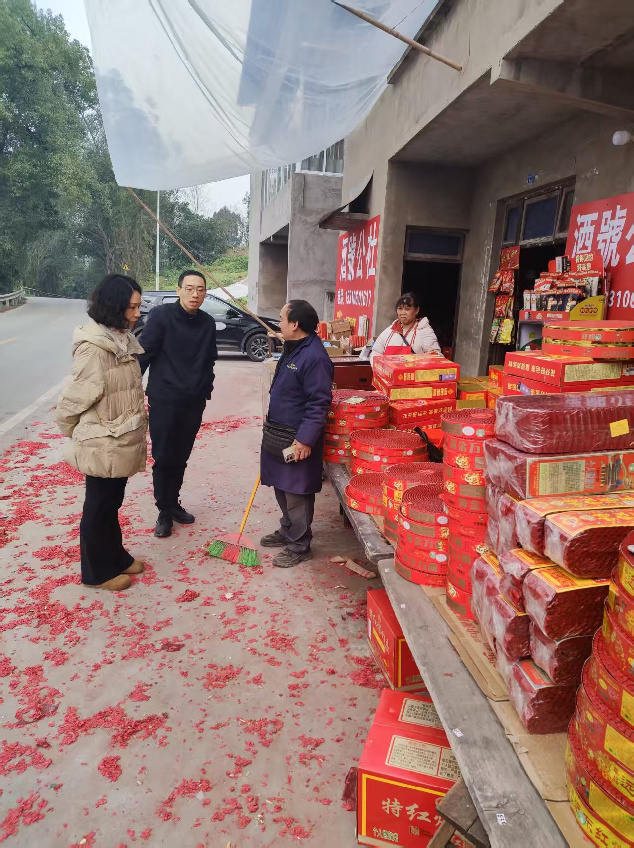 2月18日,镇党委书记斯臻带队,深入辖区烟花爆竹零售网点,开展春节期间烟花爆竹安全管理专项督导检查,全力强化全链条安全监管,做好安全宣传引导,守住安全生产底线,保障群众生命财产安全。检查组先后走访辖区15家家烟花爆竹零售点,通过实地查看、现场询问的方式,重点检查经营户合法经营资质、烟花爆竹存放规范情况,核查消防设施是否完好、安全警示标识是否张贴到位,细致排查经营过程中的各类安全隐患。