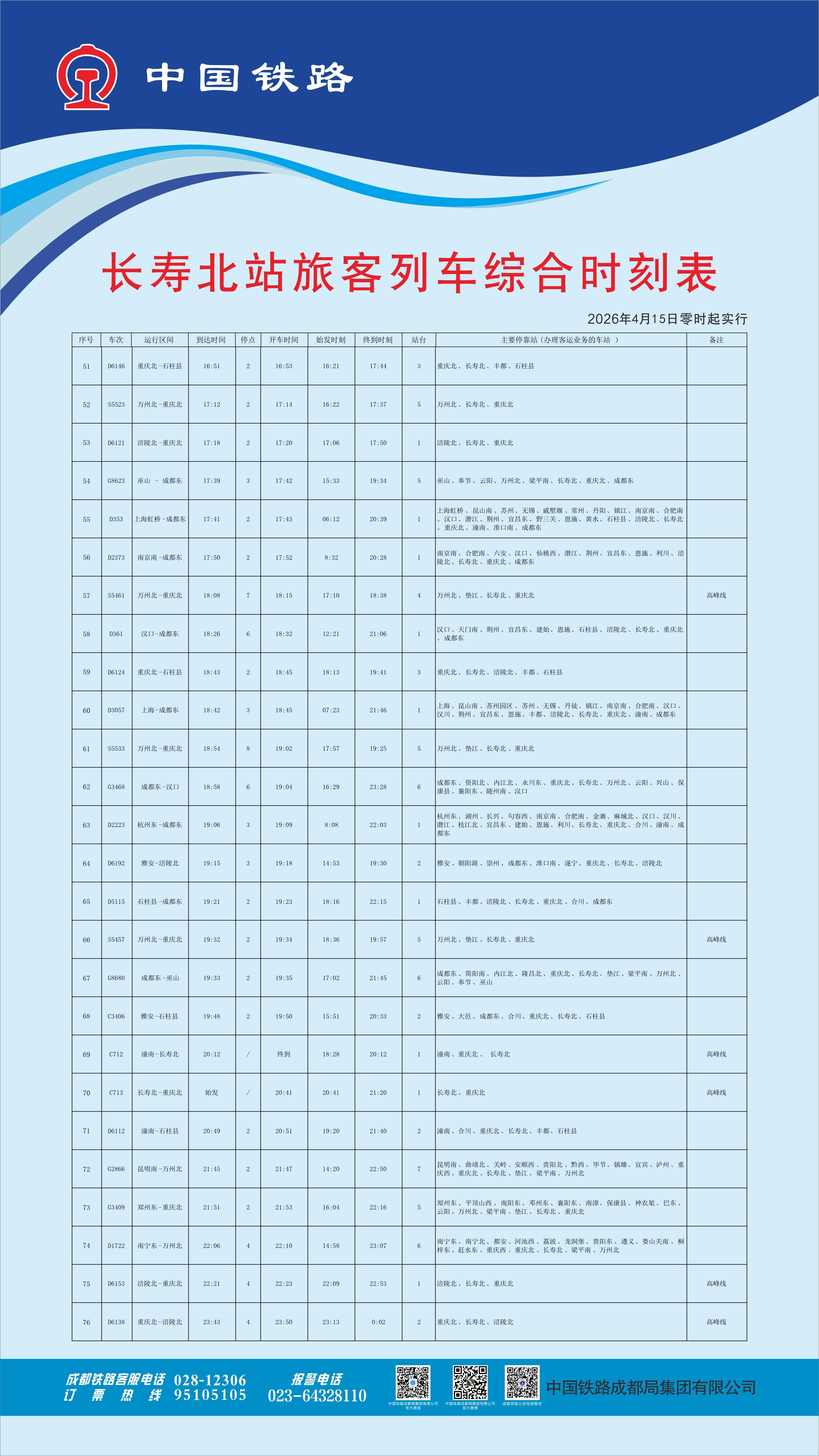 根据统一安排,从4月15日零时起,长寿北站将实行新的列车运行图,部分线路将有所调整。