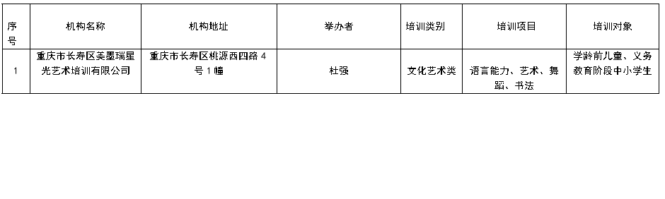 根据《重庆市教育委员会等六部门关于印发《重庆市非学科类校外培训机构审批流程(试行)》的通知》文件精神,经重庆市长寿区教育委员会和重庆市长寿区文化和旅游发展委员会联合对材料审核和办学条件现场等程序,决定拟同意设立重庆市长寿区美墨瑞星光艺术培训有限公司,现依规予以公示: