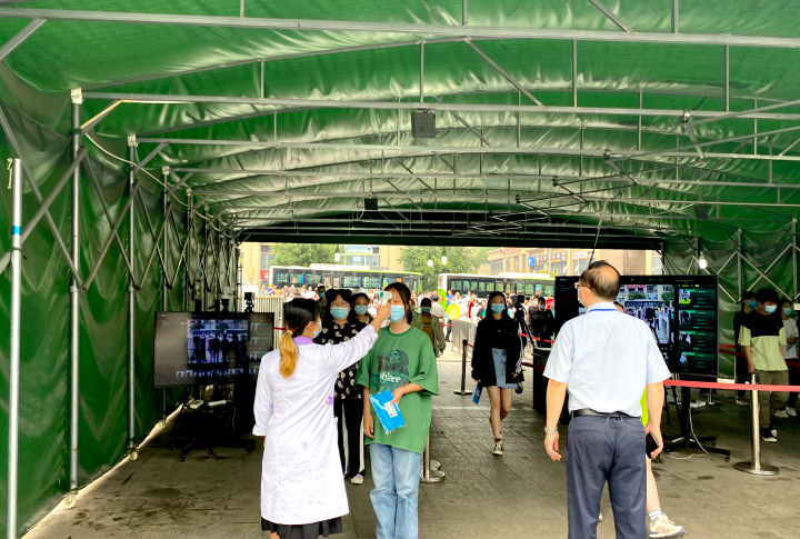 6月7日早上8点,记者在川维中学考点看到,考生陆续到达考点,并依次排队进入测温通道,进行入场体温检测。考点工作人员一边维持秩序,一边提醒考生戴好口罩,做好防疫措施。