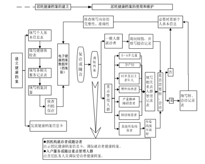 1.辖区居民到乡镇卫生院、村卫生室、社区卫生服务中心(站)接受服务时,由医务人员负责为其建立居民健康档案,并根据其主要健康问题和服务提供情况填写相应记录,同时为服务对象填写并发放居民健康档案信息卡。建立电子健康档案的地区,逐步为服务对象制作发放居民健康卡,替代居民健康档案信息卡,作为电子健康档案进行身份识别和调阅更新的凭证。