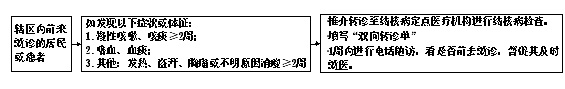 对辖区内前来就诊的居民或患者,如发现有慢性咳嗽、咳痰≥2周,咯血、血痰,或发热、盗汗、胸痛或不明原因消瘦等肺结核可疑症状者,在鉴别诊断的基础上,填写“双向转诊单”。推荐其到结核病定点医疗机构进行结核病检查。1周内进行电话随访,了解是否前去就诊,督促其及时就医。