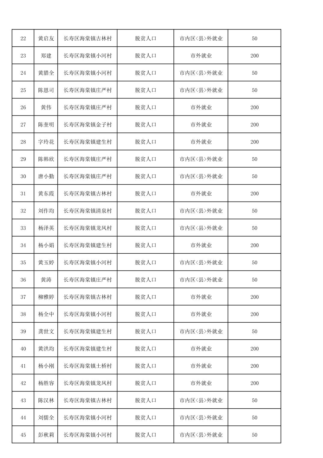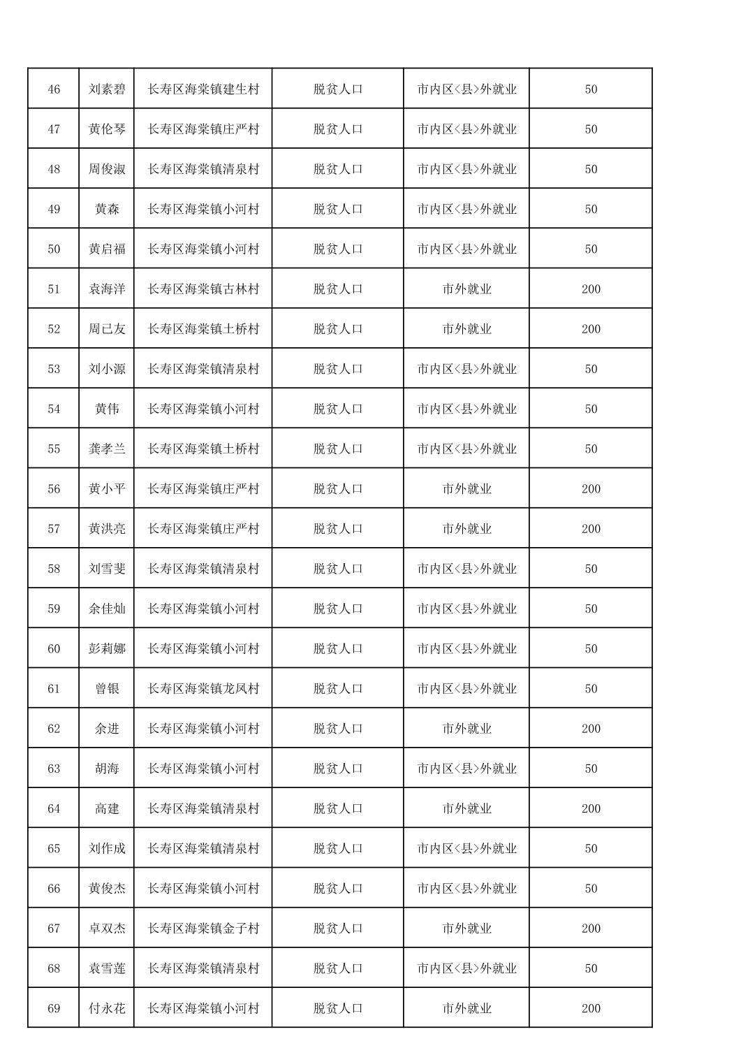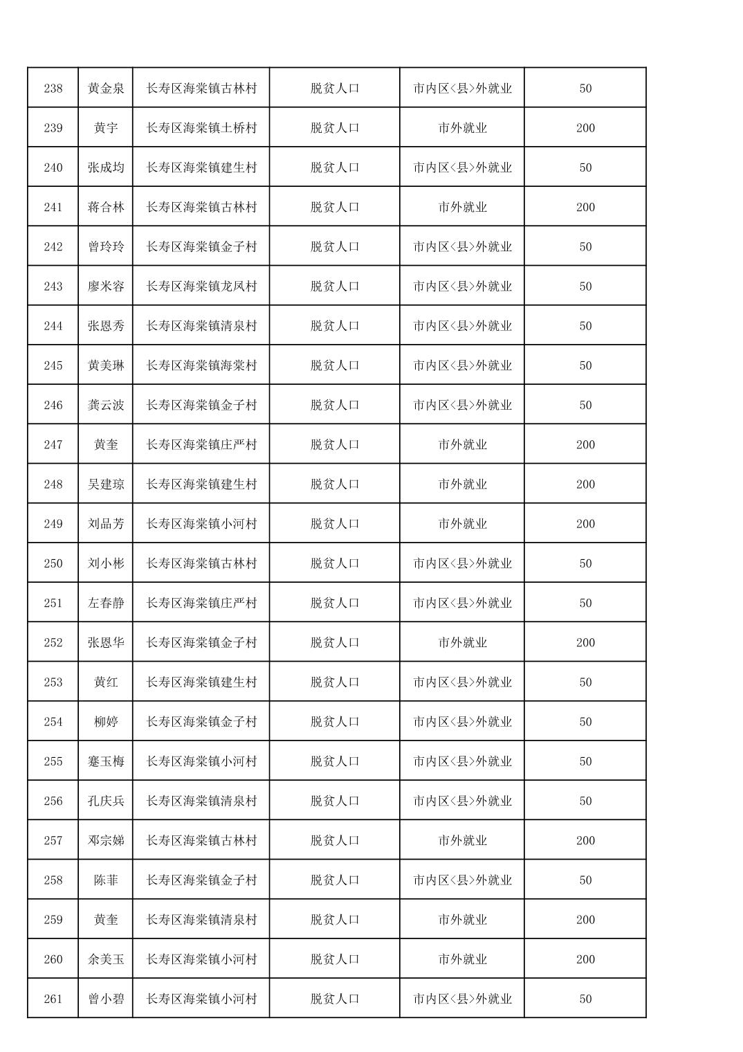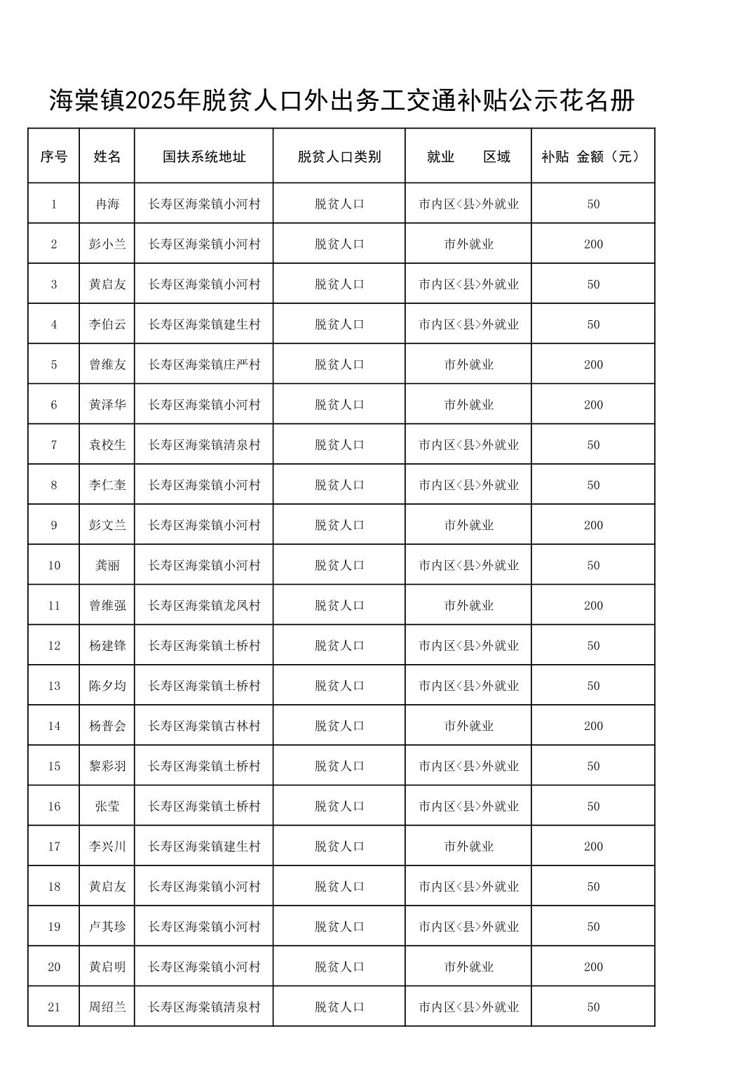 海棠镇2025年脱贫人口外出务工交通补贴公示花名册