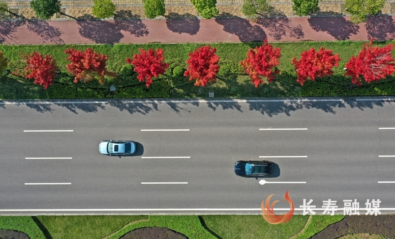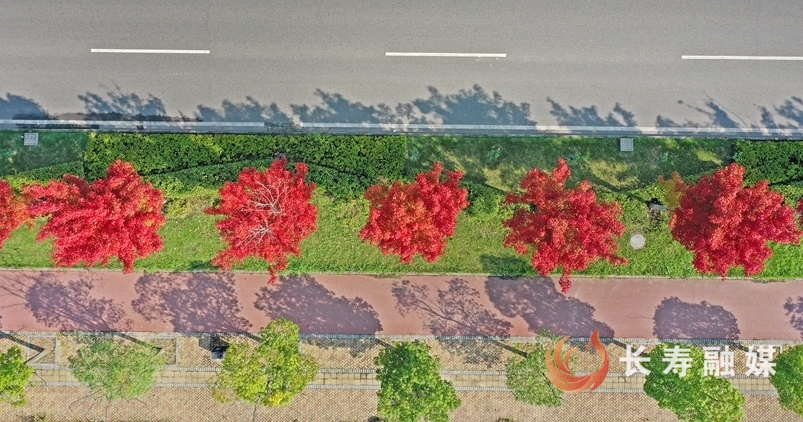 阳光明媚,记者在北城大道看到,道路两侧延绵数公里的红枫红得似火、艳若云霞,将这条城市干道装点成一条如诗如画的“红叶长廊”,吸引不少市民游客前来打卡。