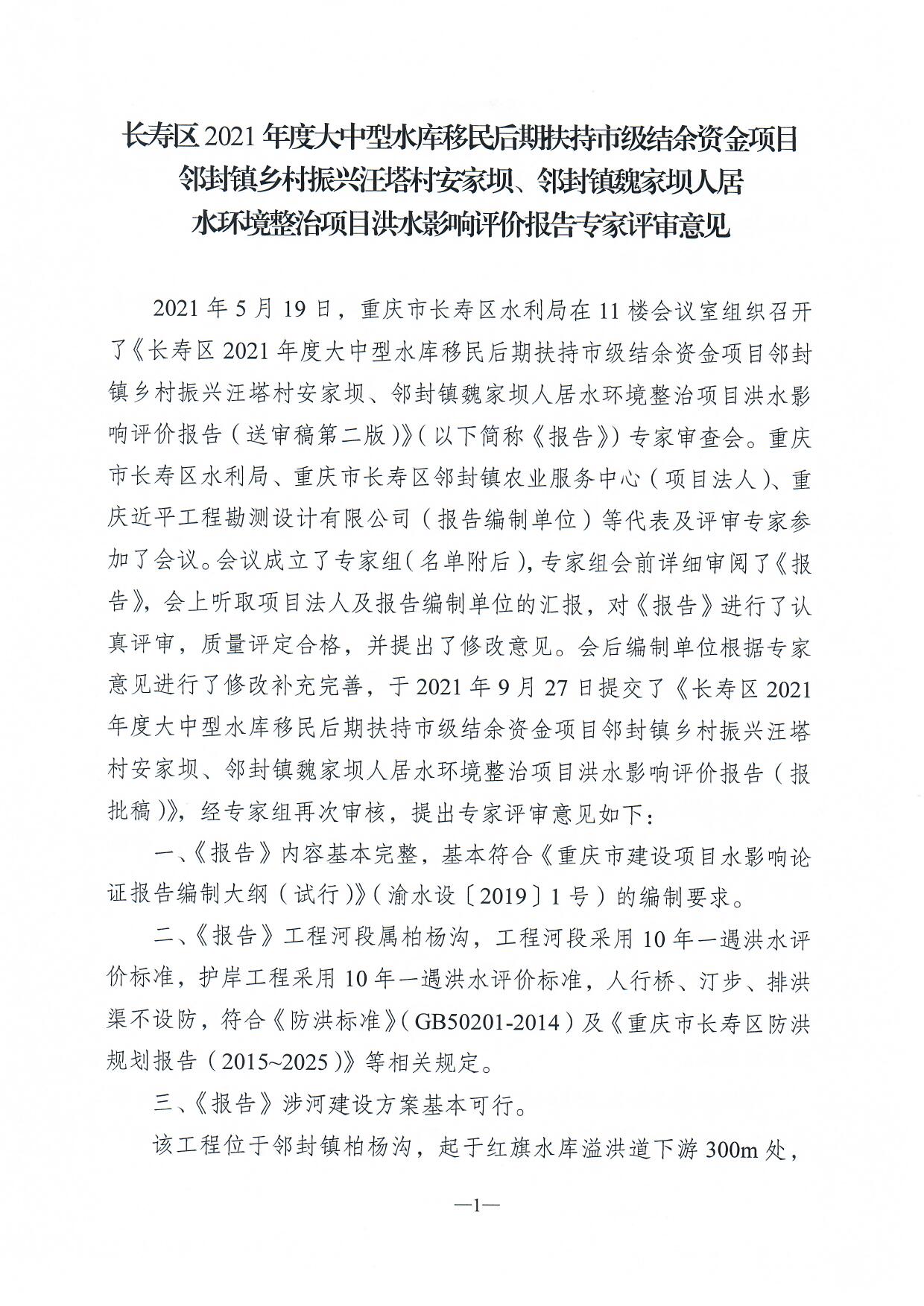 一、同意长寿区2021年度大中型水库移民后期扶持市级结余资金项目邻封镇乡村振兴汪塔村安家坝、邻封镇魏家坝人居水环境整治项目洪水影响评价报告的结论
