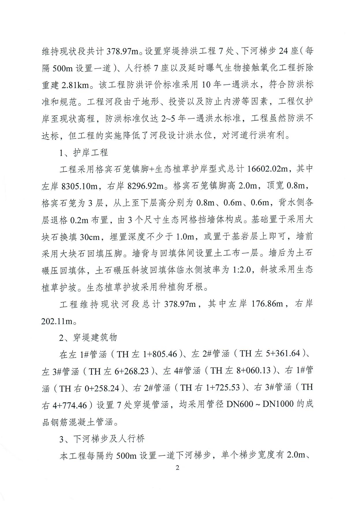 (一)评价河段防洪标准为10年一遇,拟建护岸工程防洪标准为10年一遇,人行桥防洪标准为10年一遇,拆除重建延时曝气生物接触氧化工程防洪标准为20年一遇。