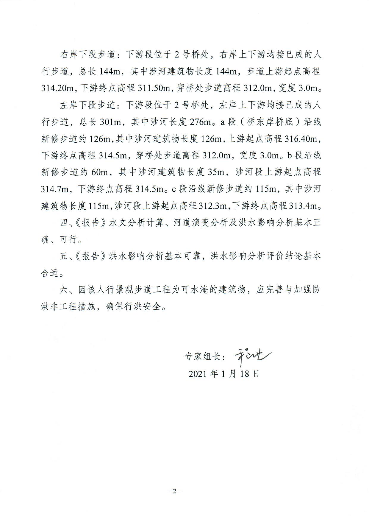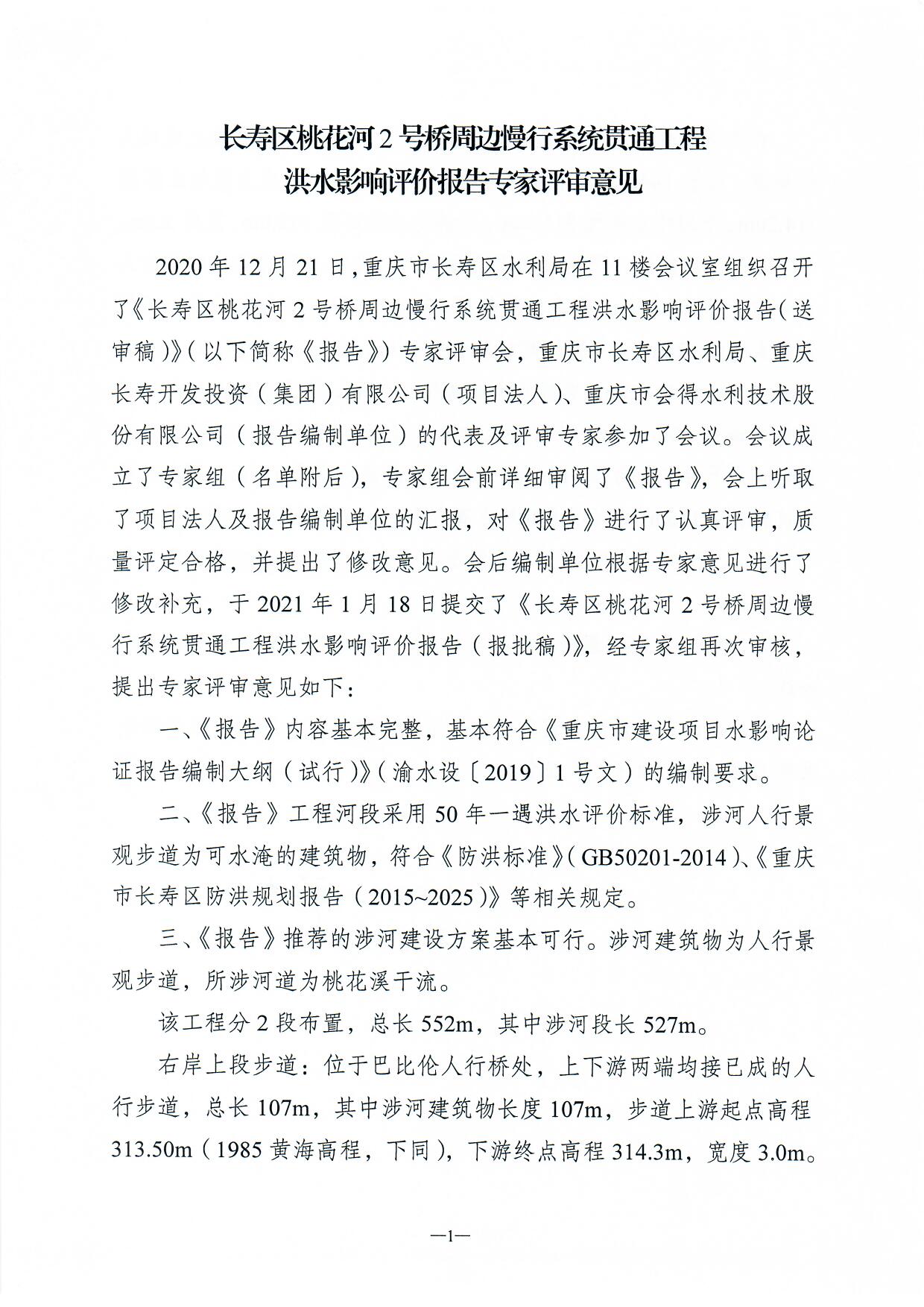 一、同意长寿区桃花河2号桥周边慢行系统贯通工程洪水影响评价报告的结论