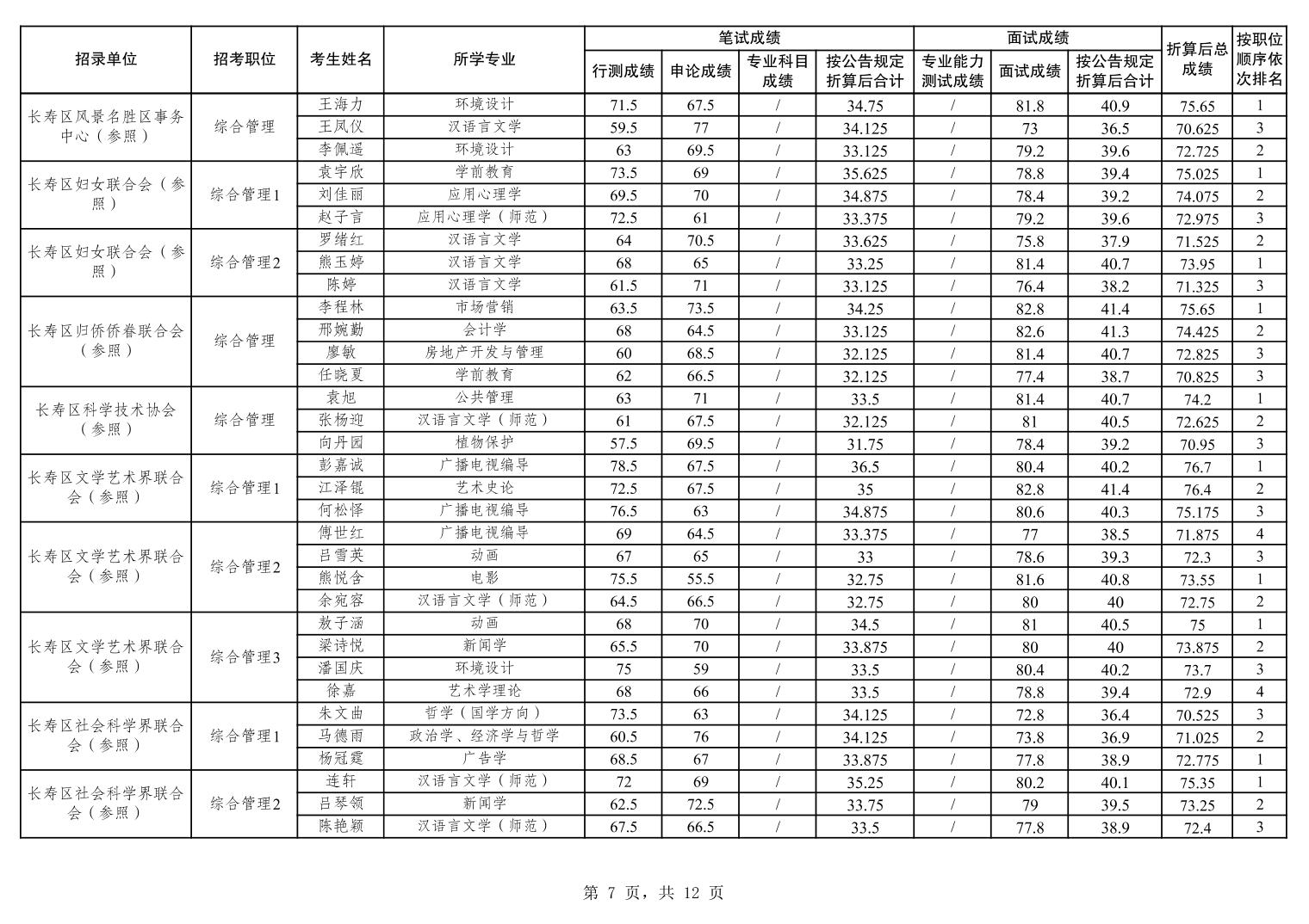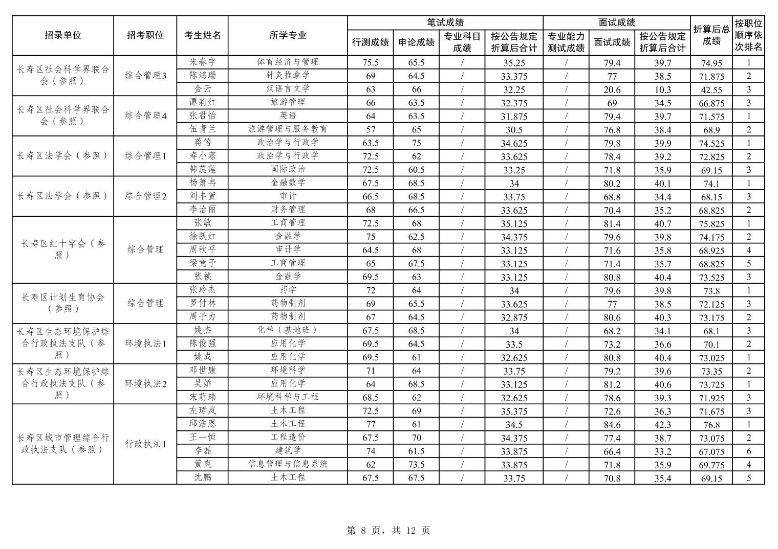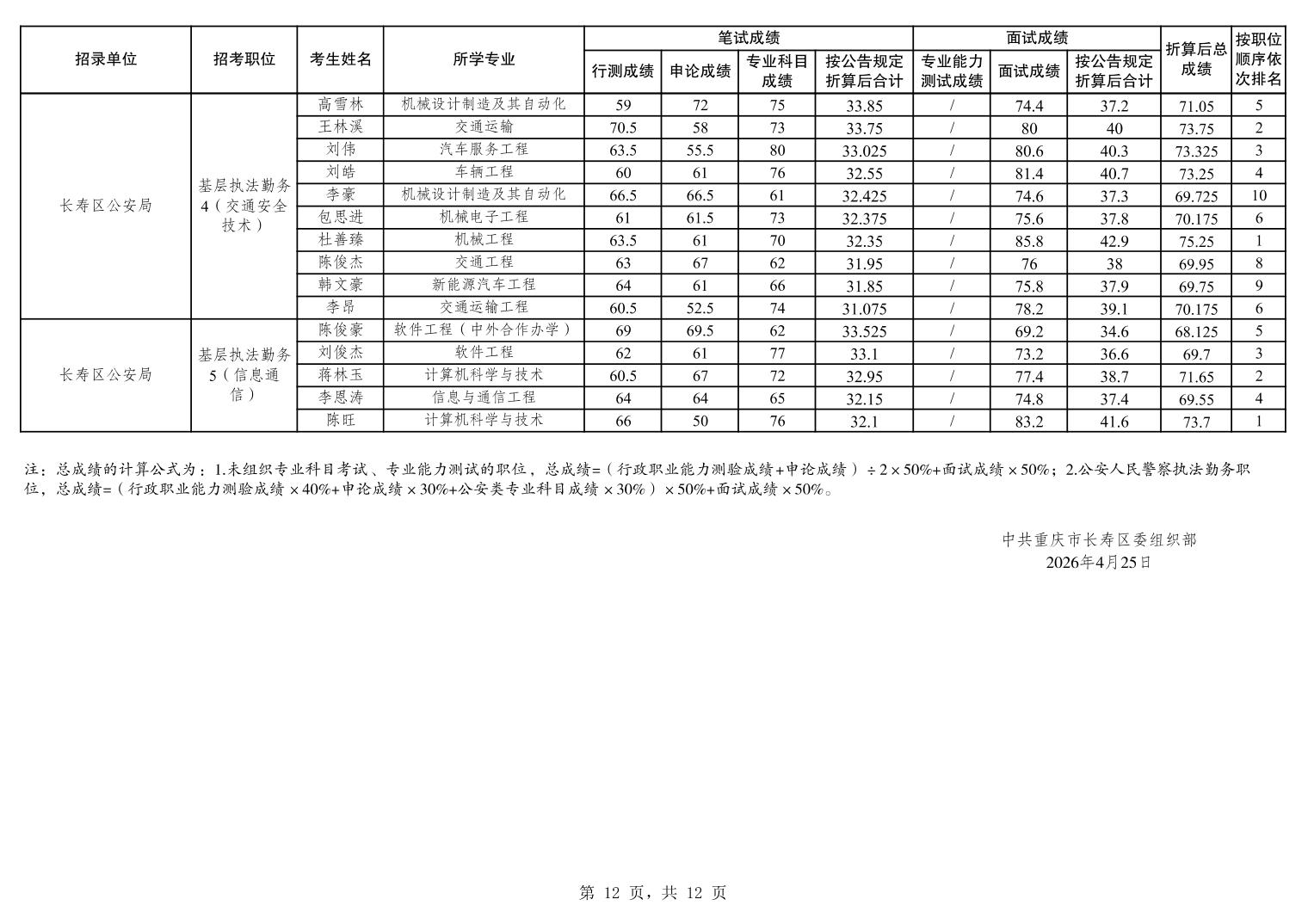 重庆市长寿区2026年度考试录用公务员笔试、面试和总成绩公布表