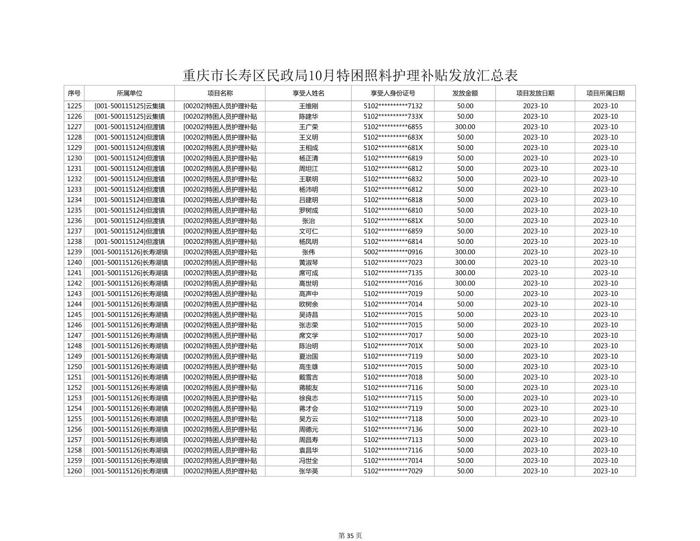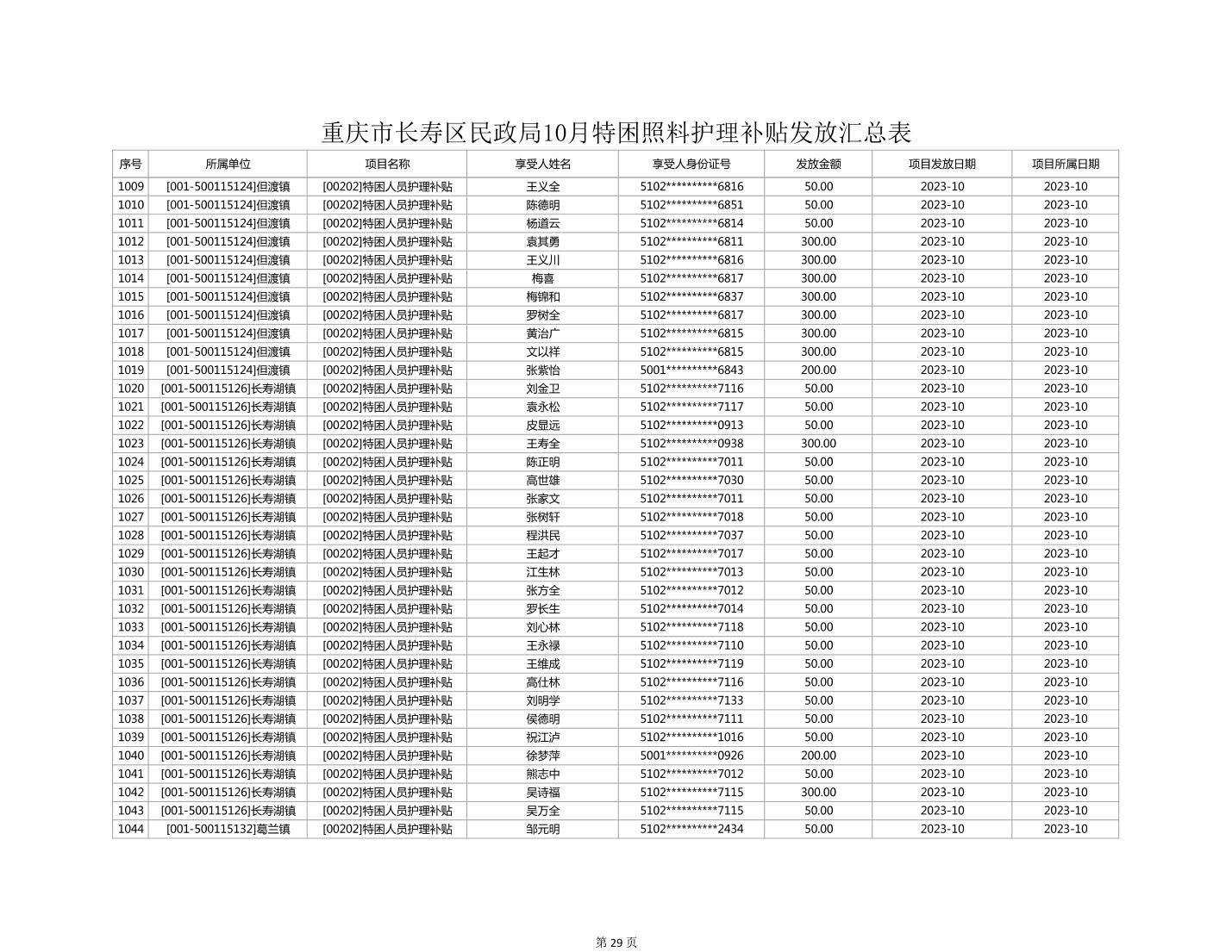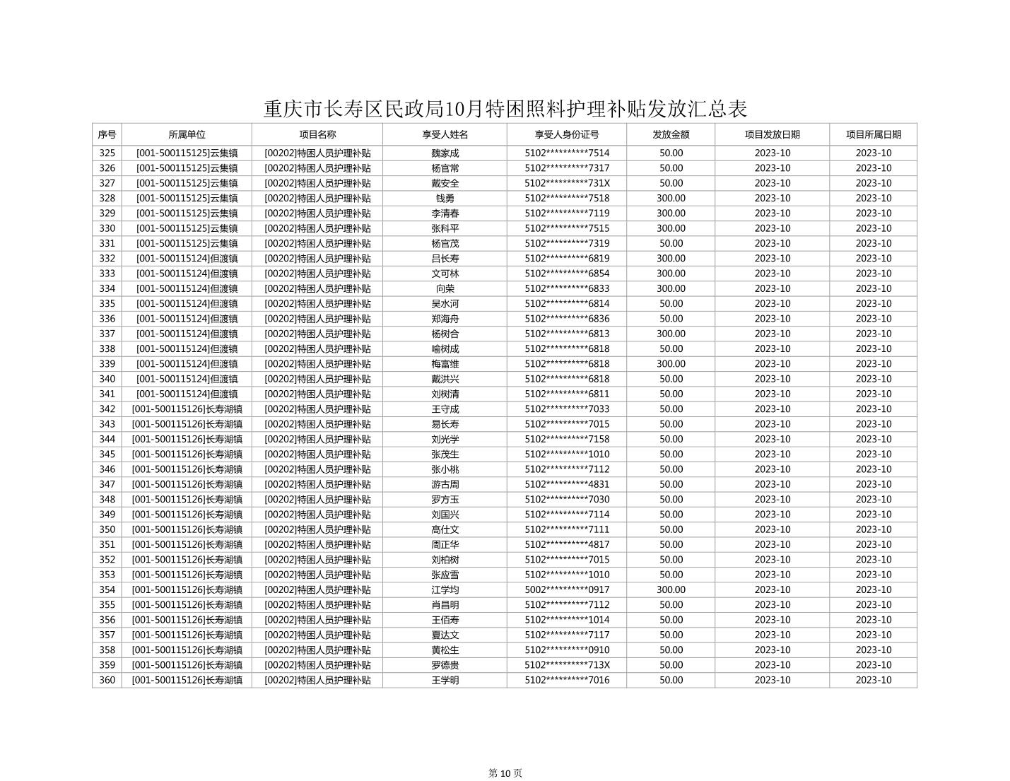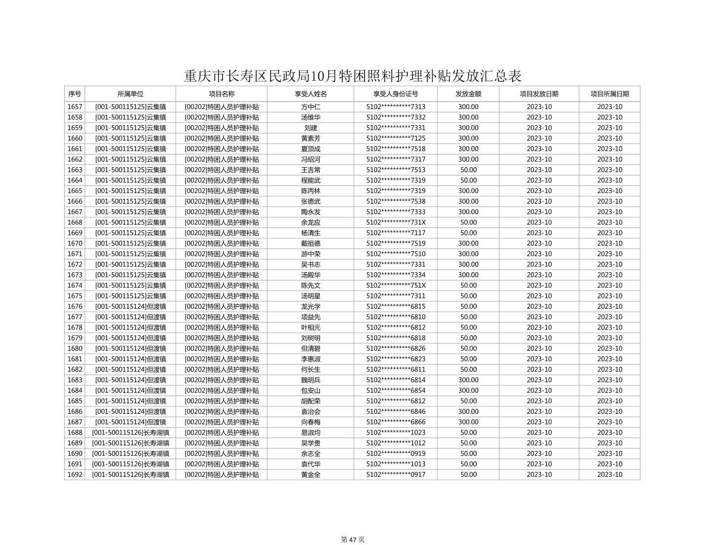 2023年10月重庆市长寿区失能特困照料护理补贴发放情况