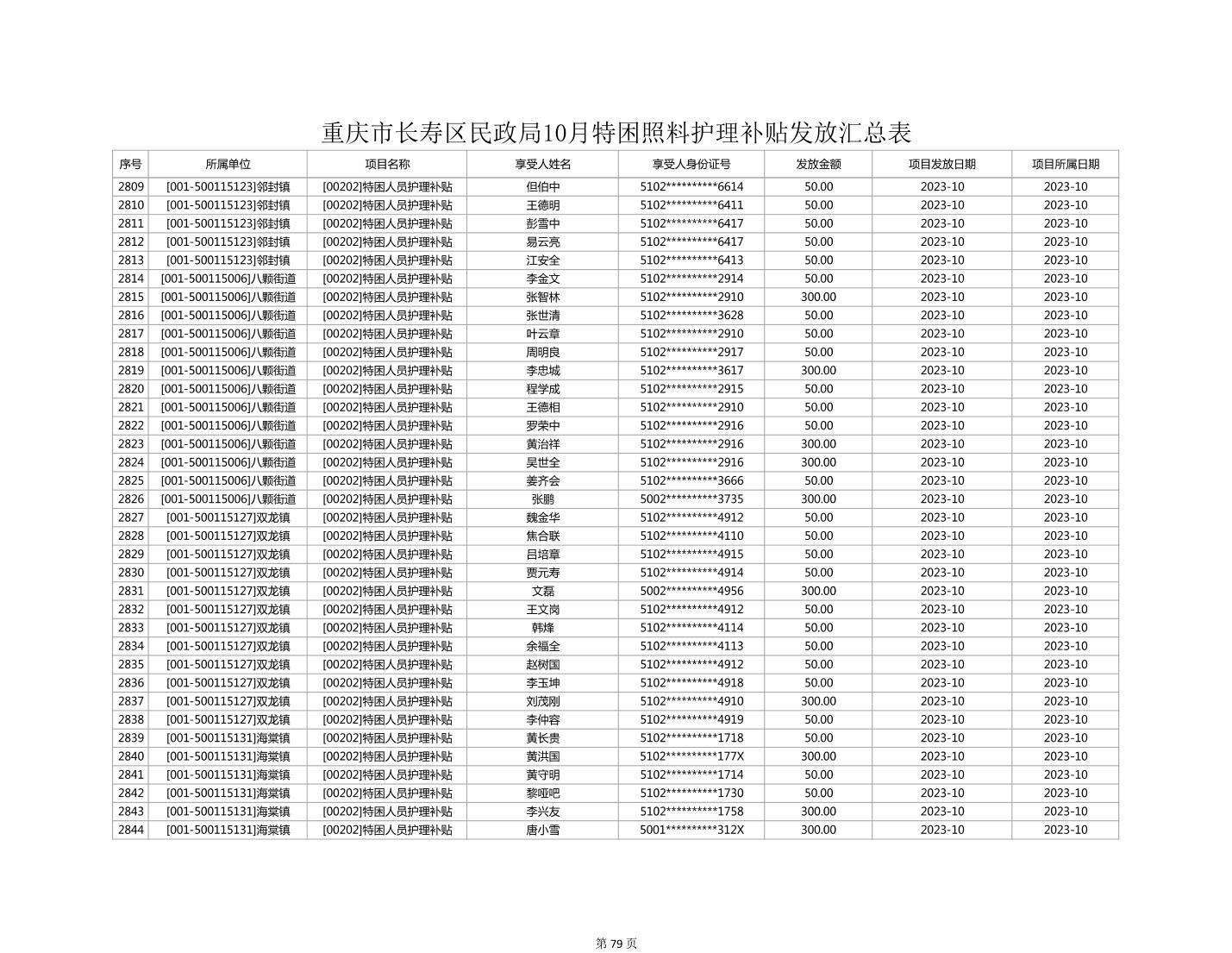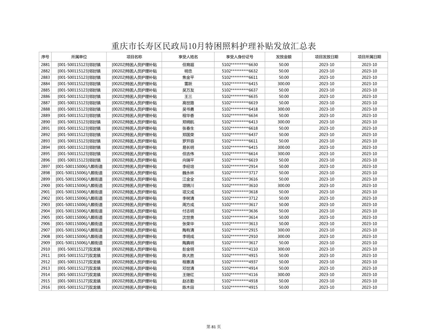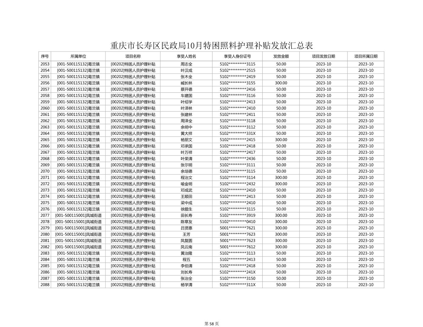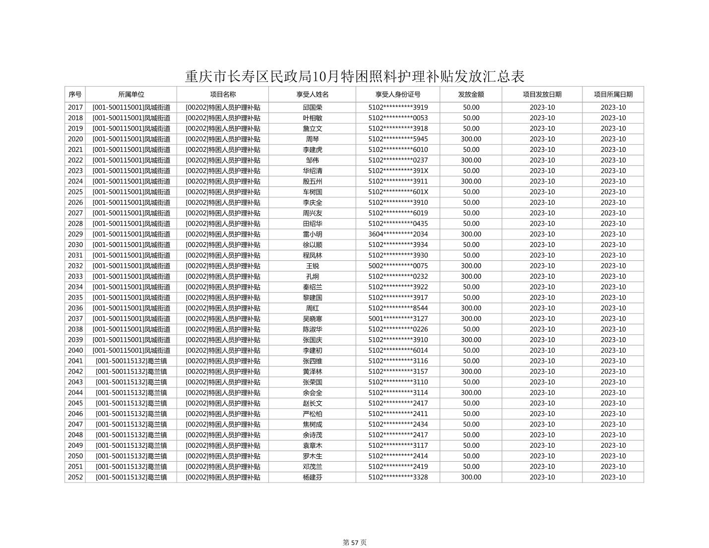 2023年10月重庆市长寿区失能特困照料护理补贴发放情况