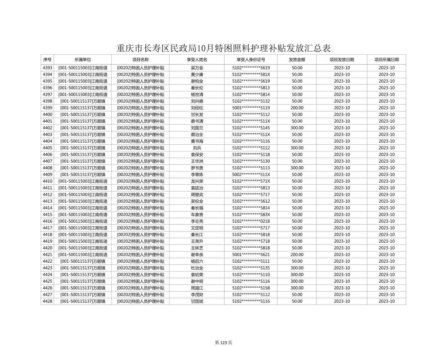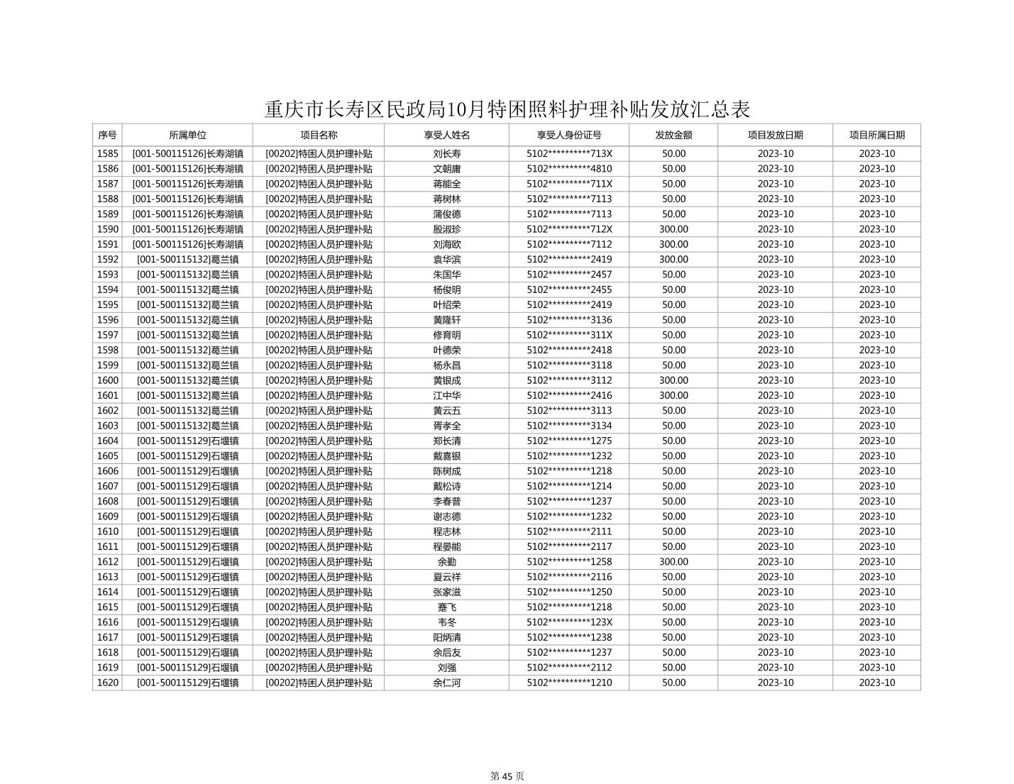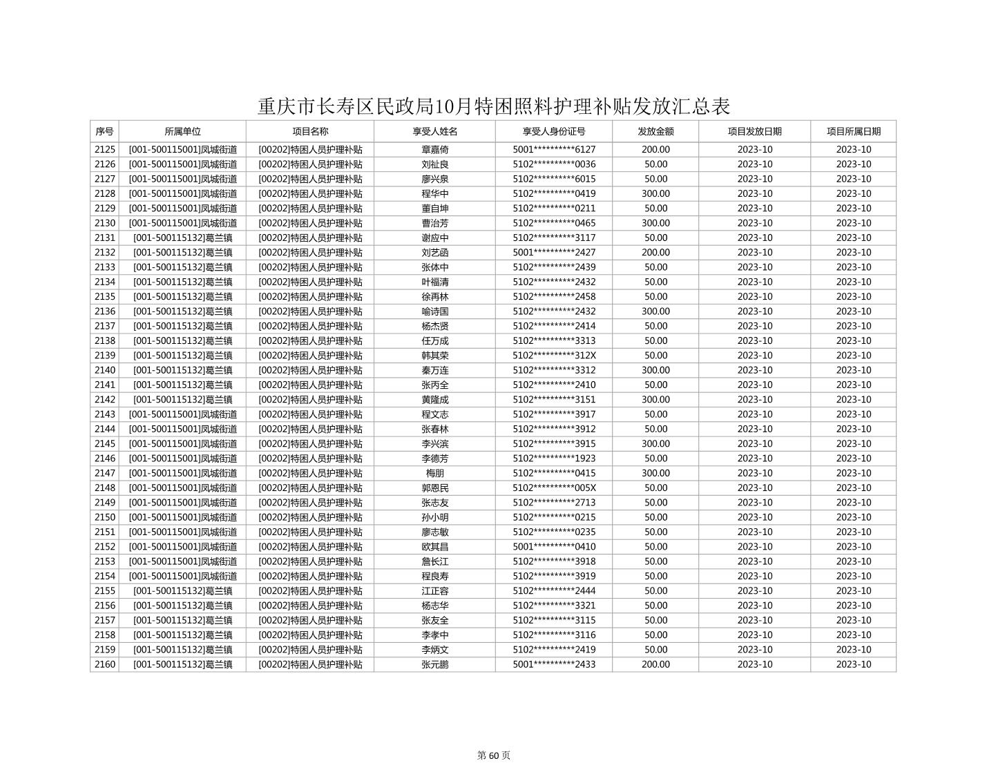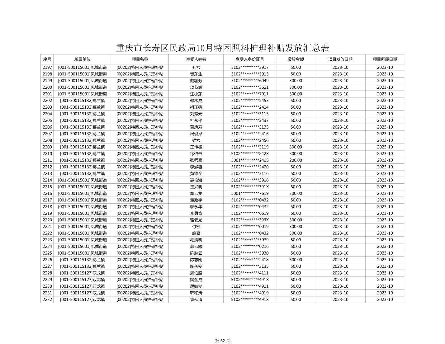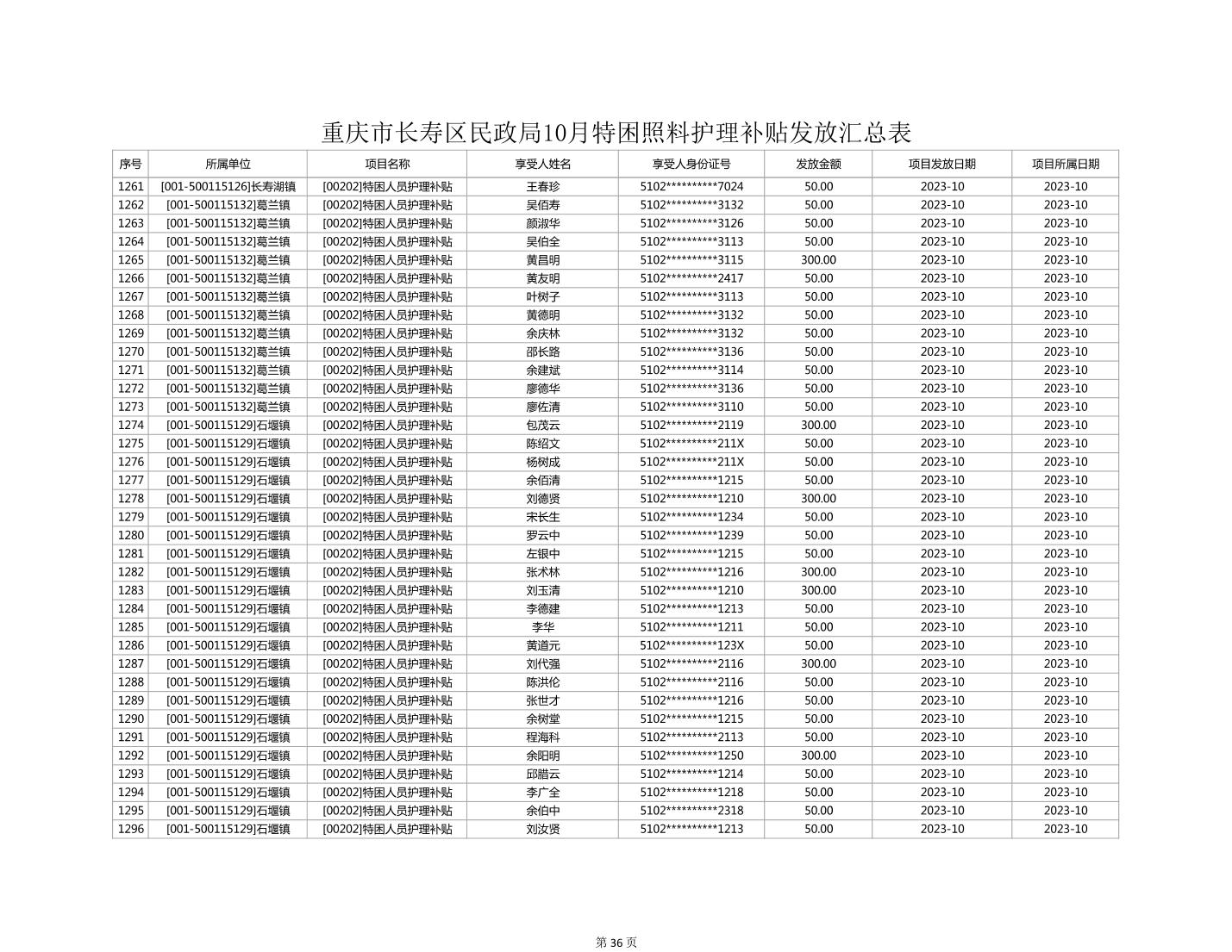 2023年10月重庆市长寿区失能特困照料护理补贴发放情况