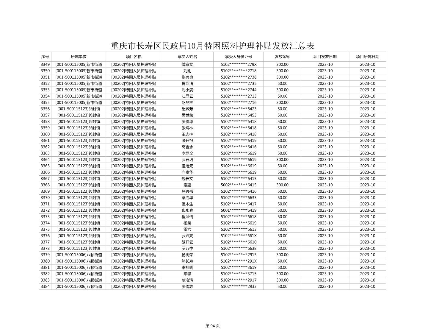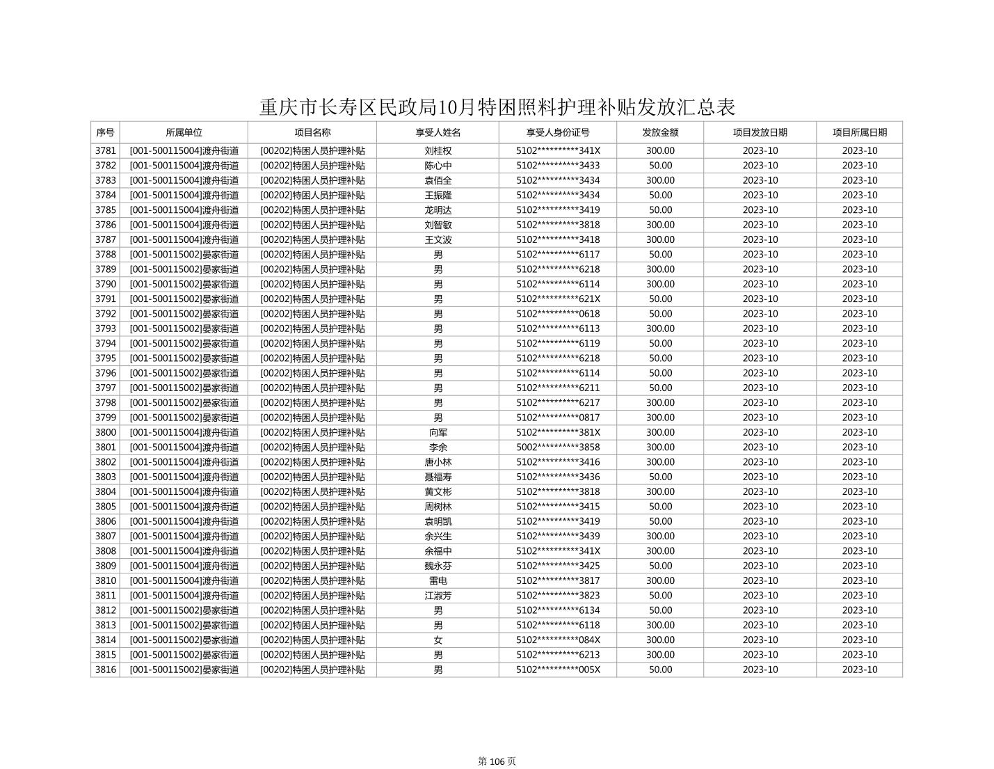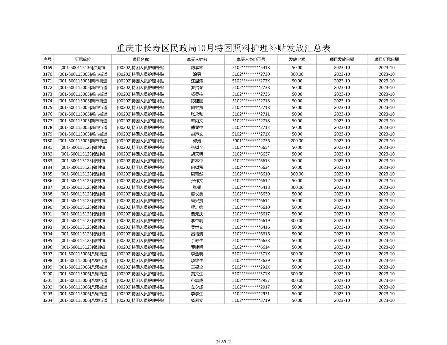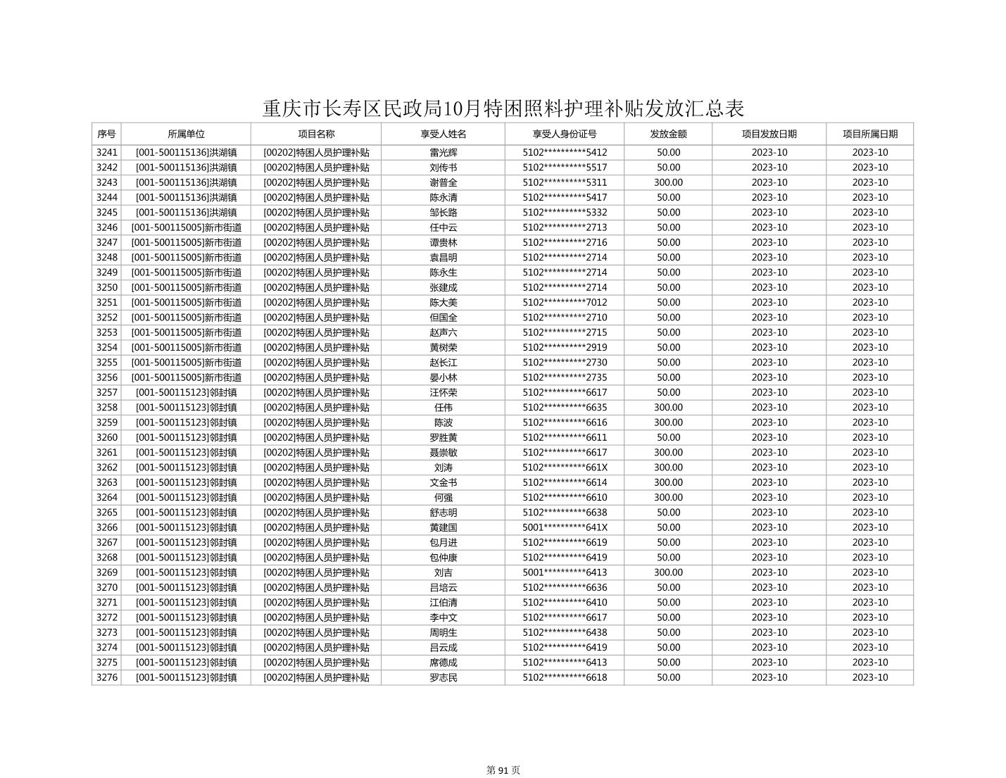 2023年10月重庆市长寿区失能特困照料护理补贴发放情况
