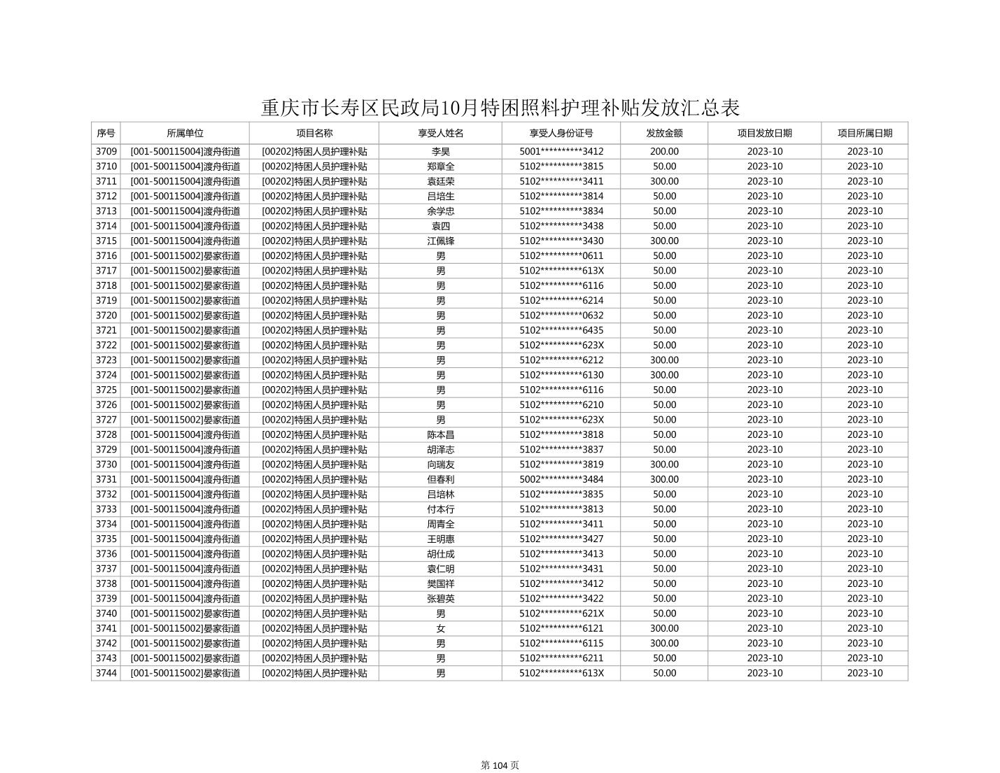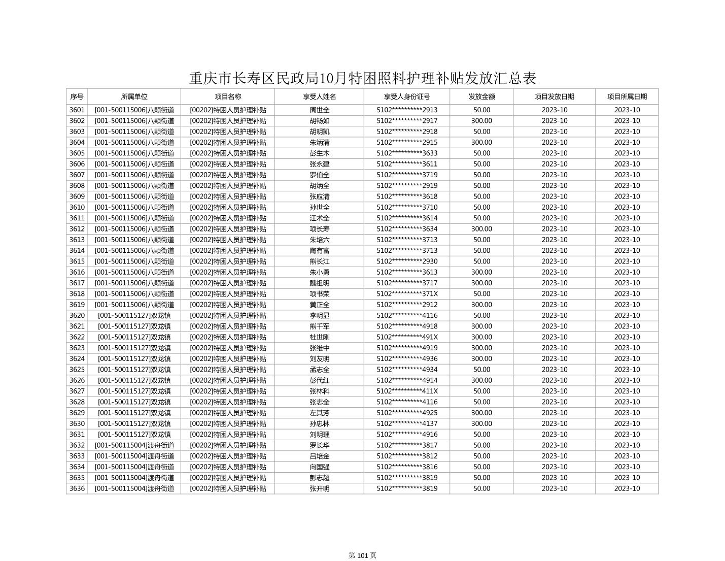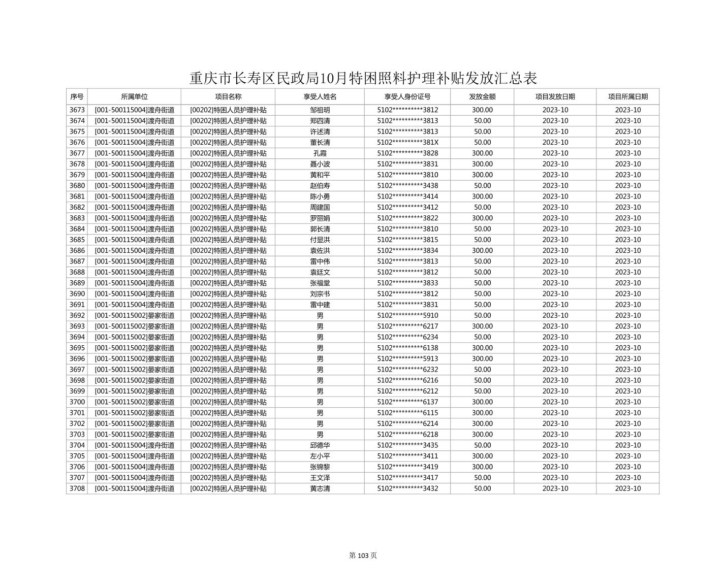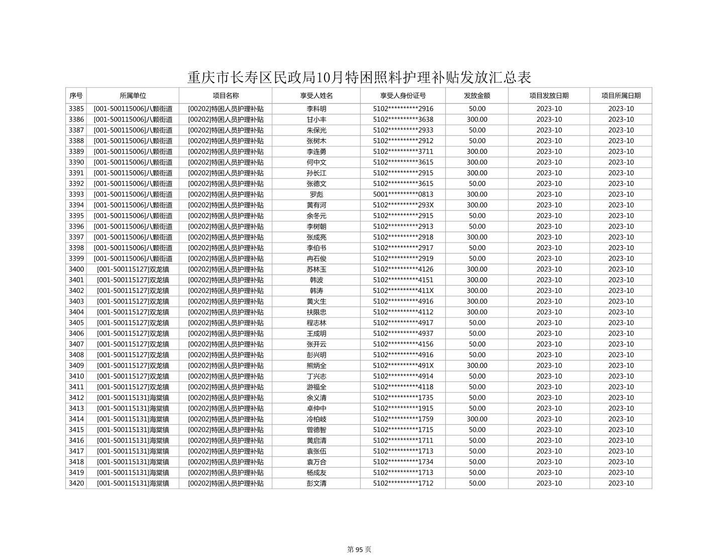 2023年10月重庆市长寿区失能特困照料护理补贴发放情况