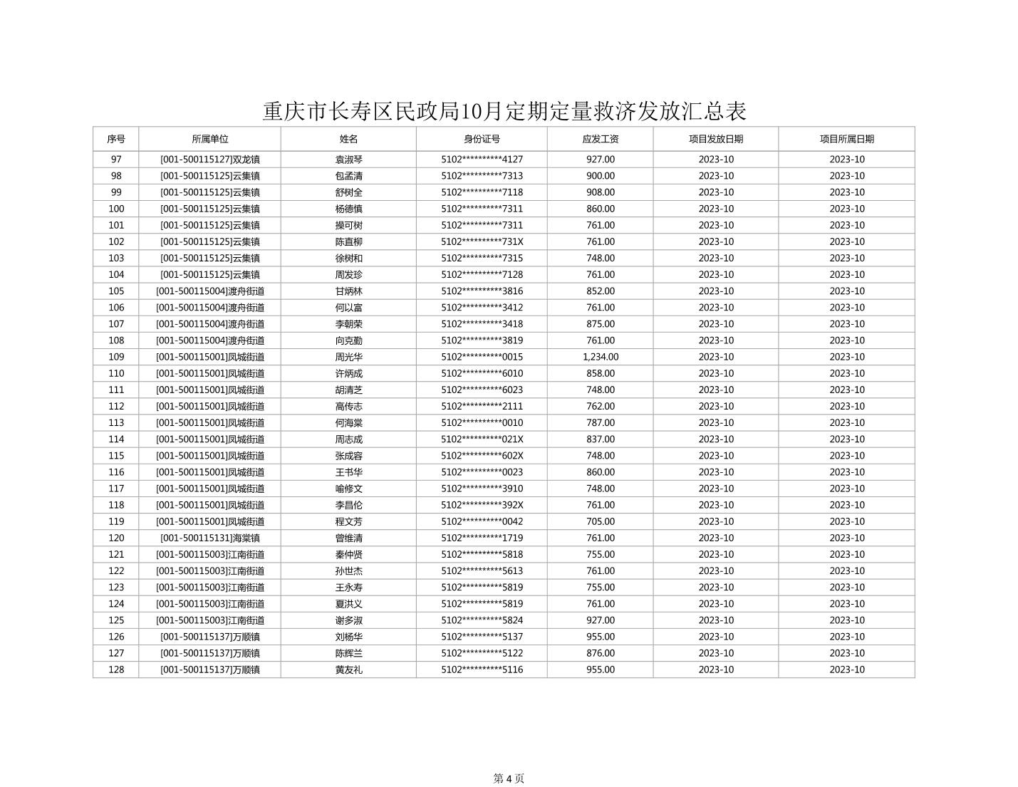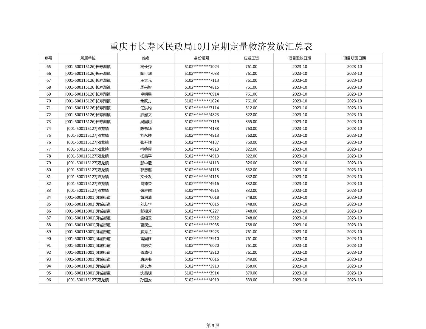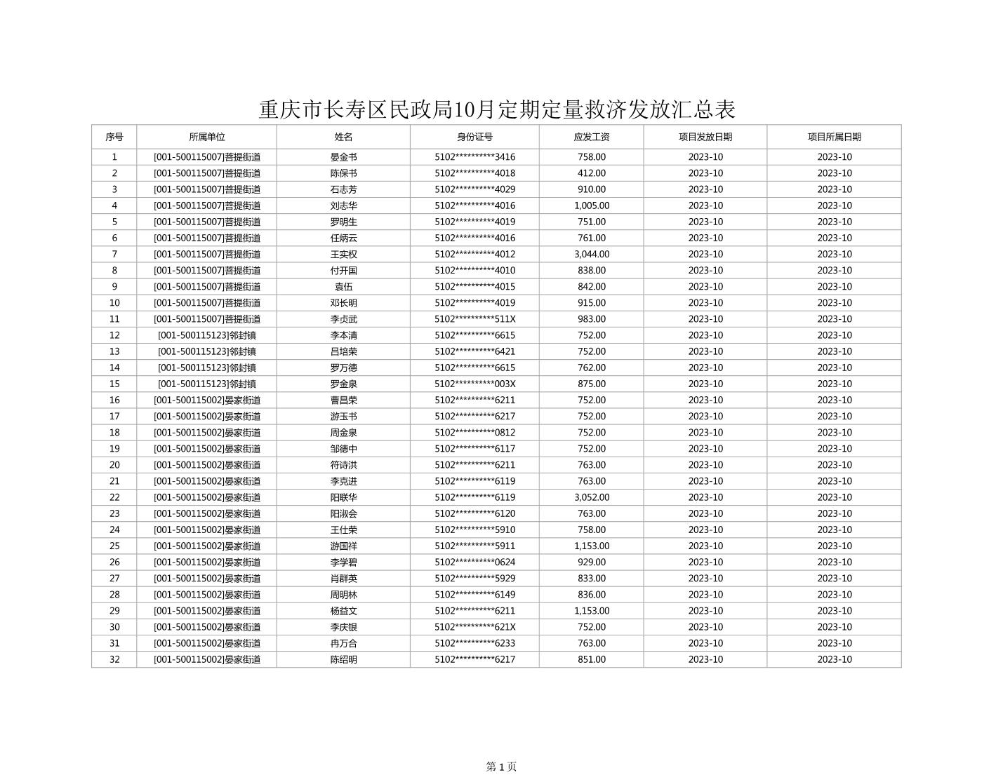 2023年10月重庆市长寿区定期定量救济金发放情况