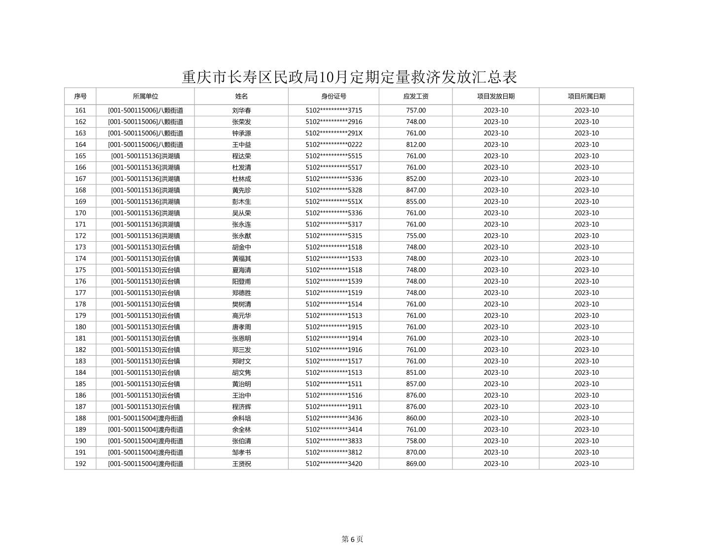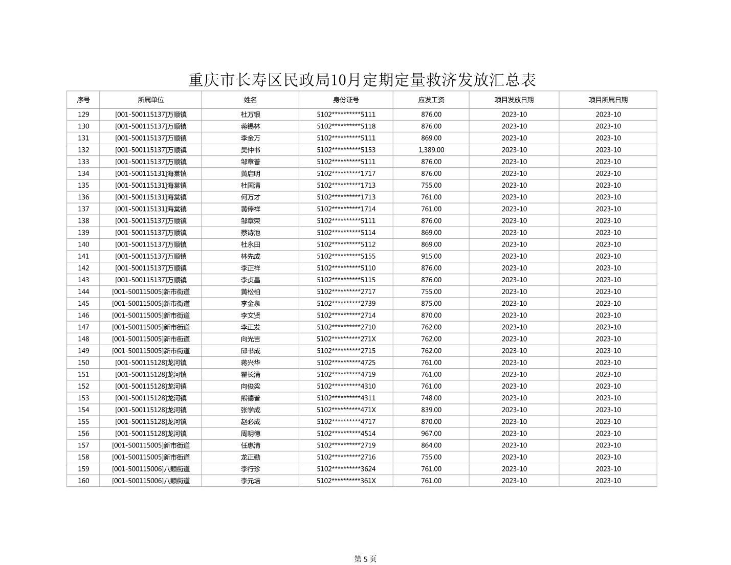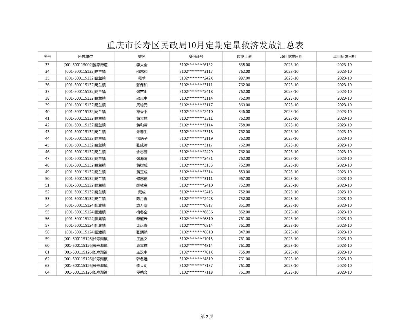 2023年10月重庆市长寿区定期定量救济金发放情况