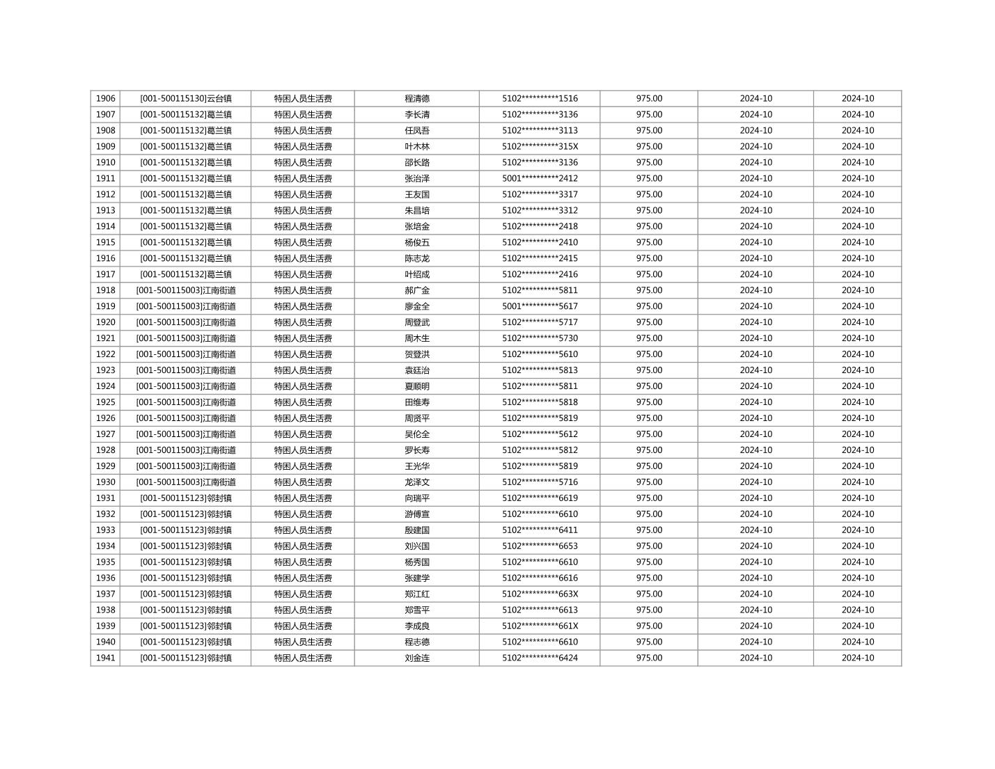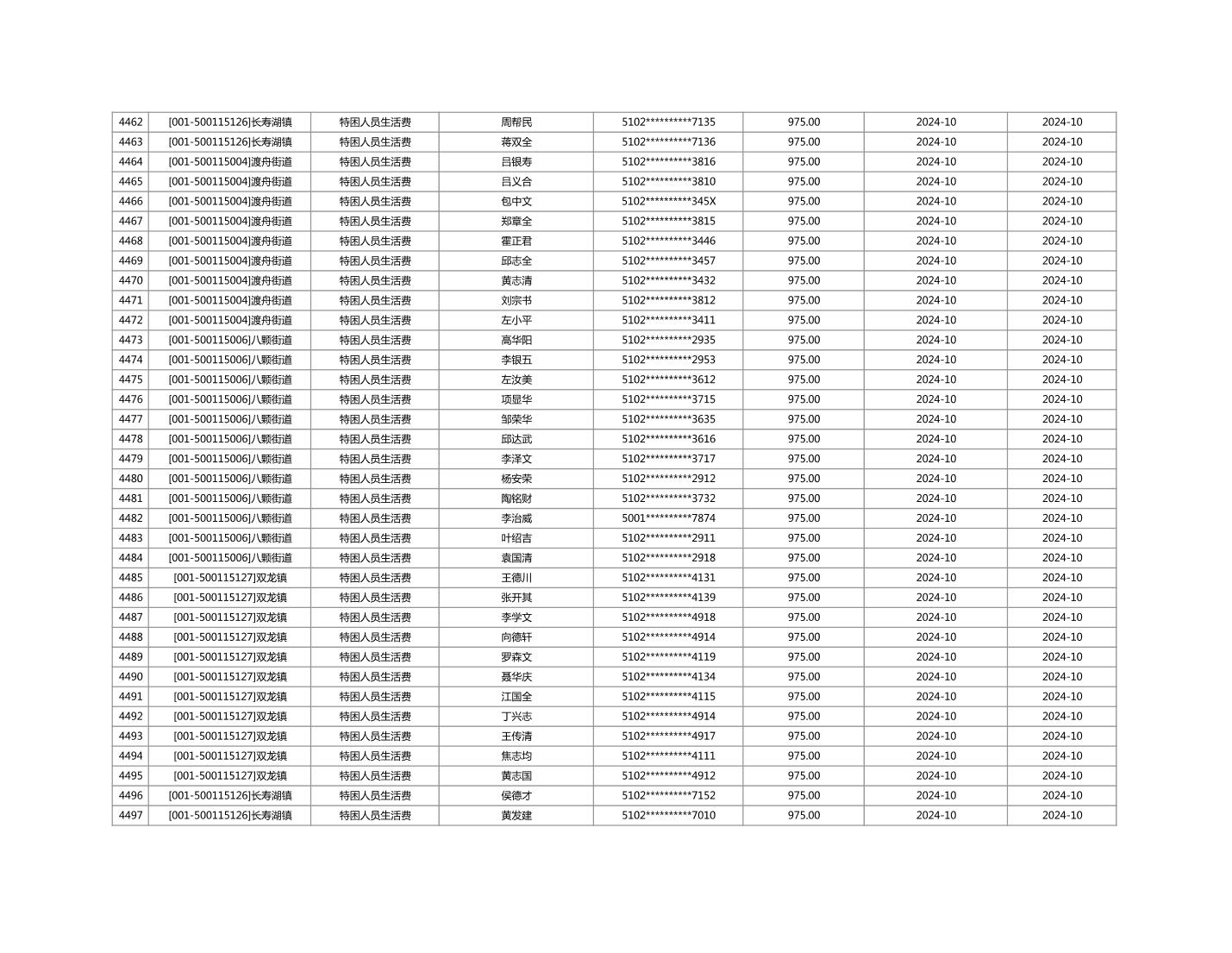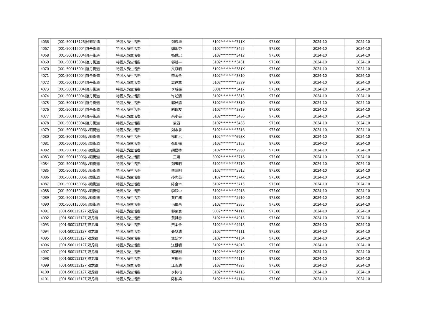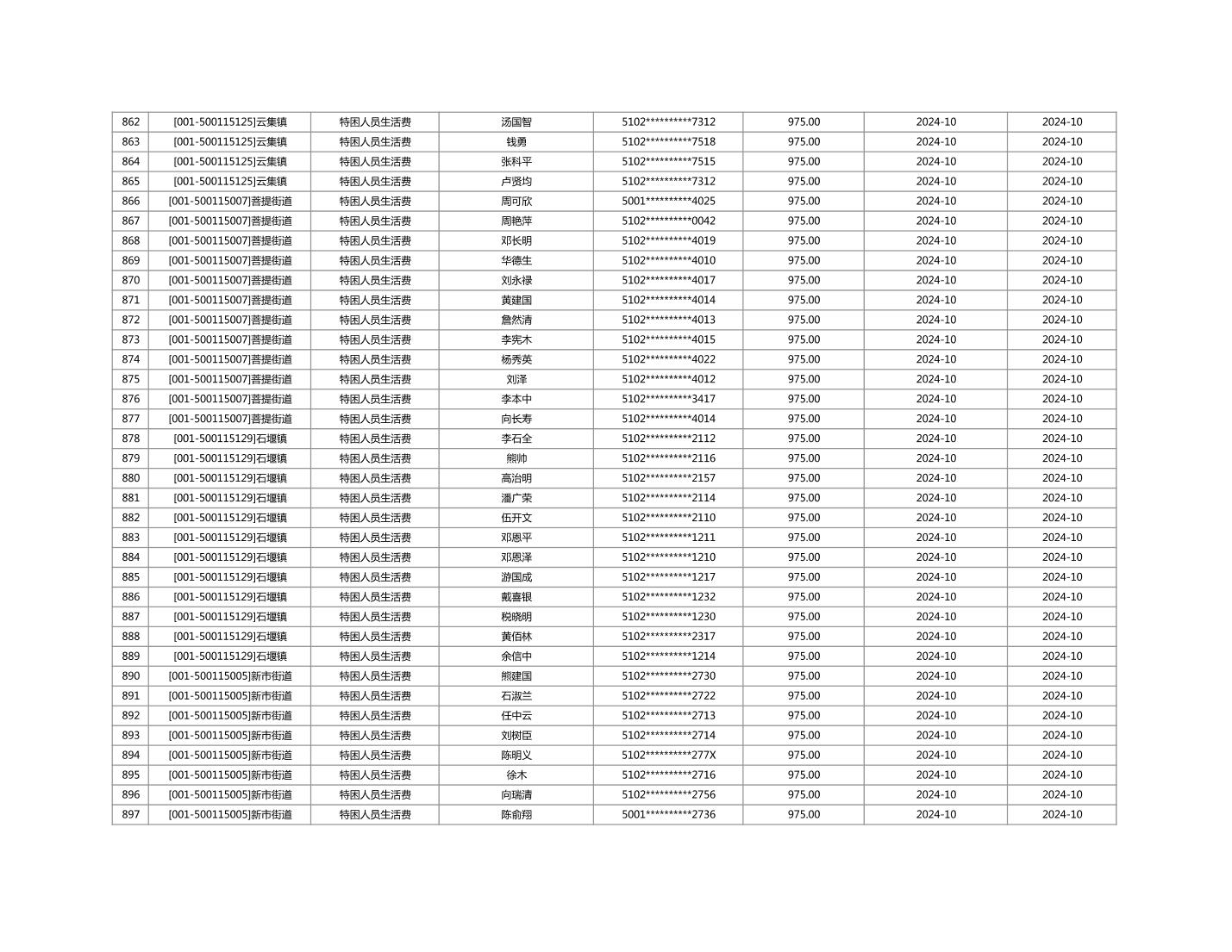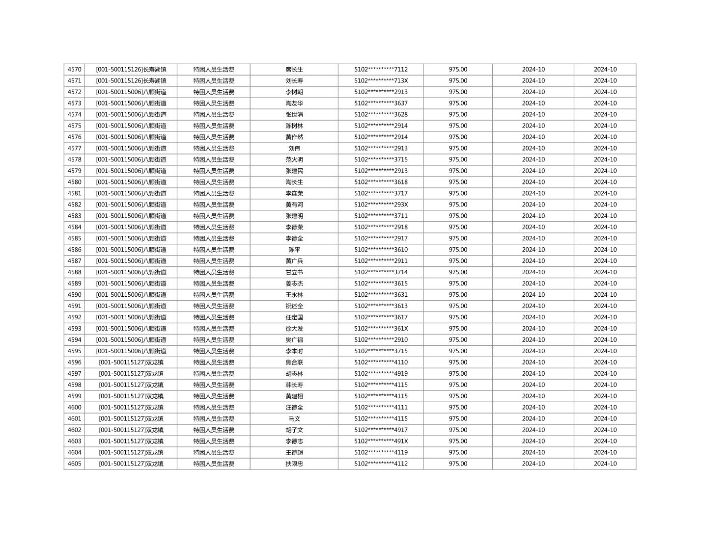 2024年10月重庆市长寿区特困救助供养资金发放情况