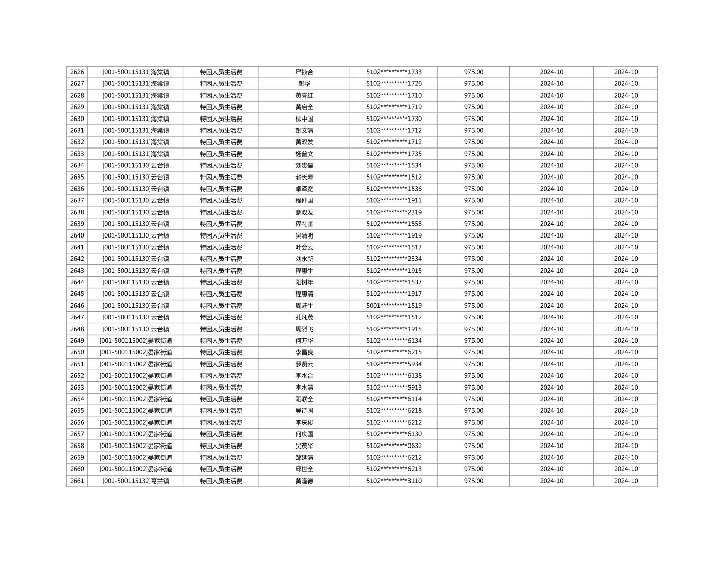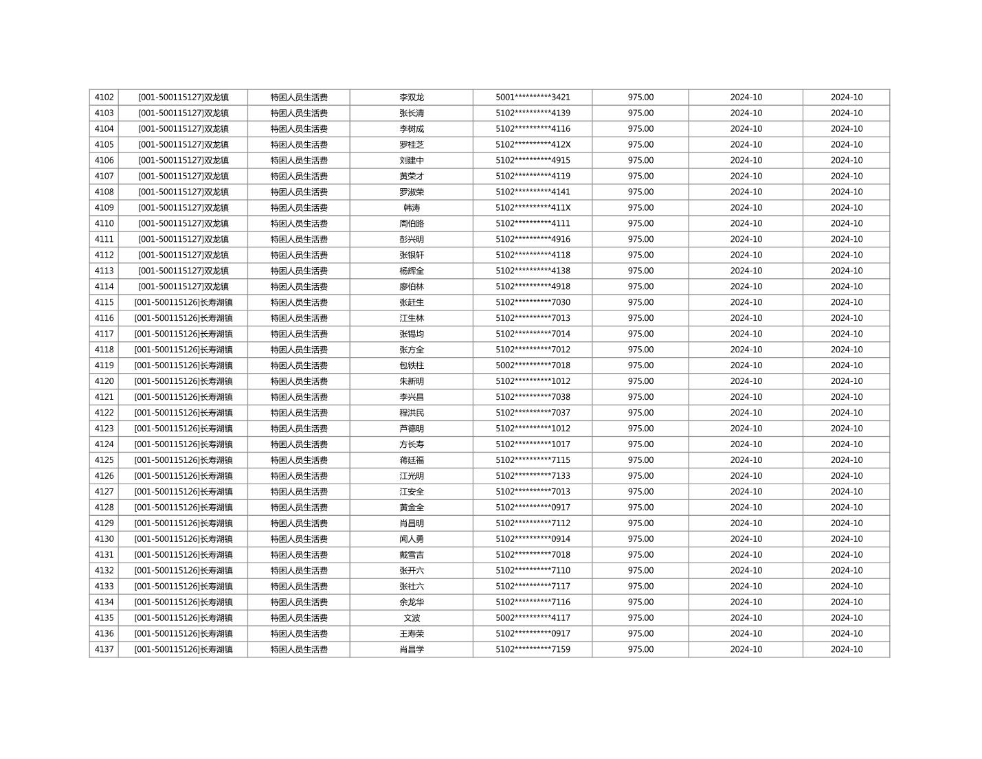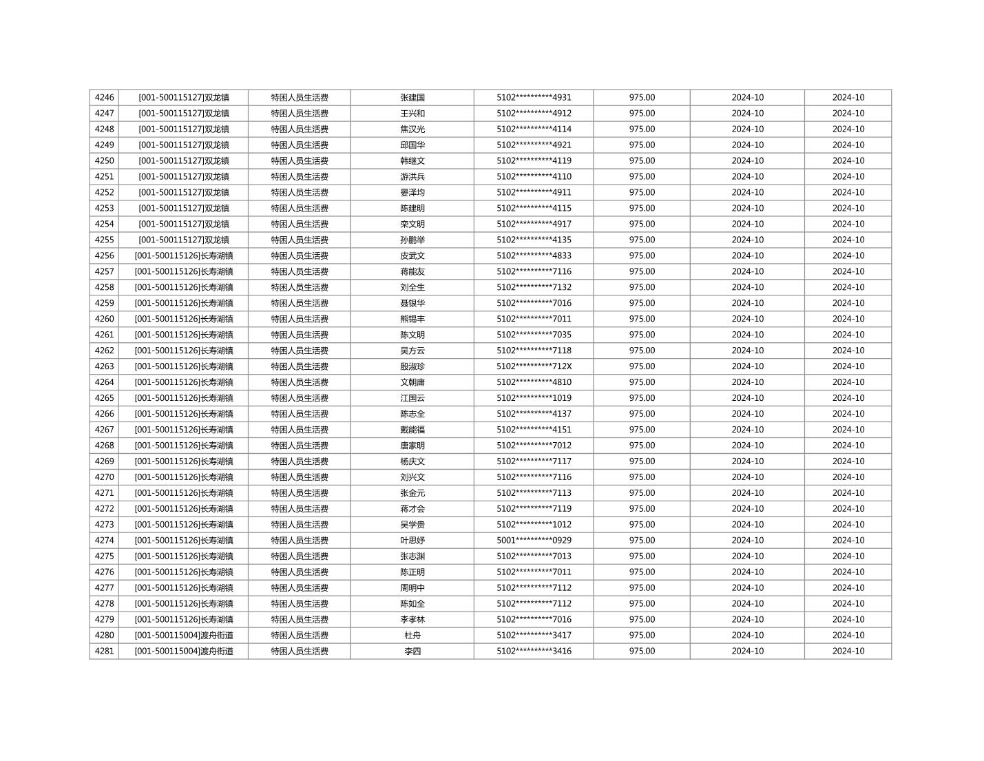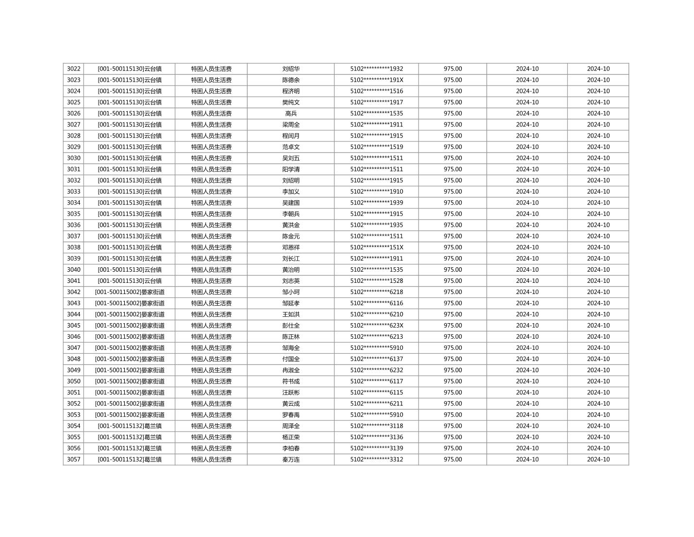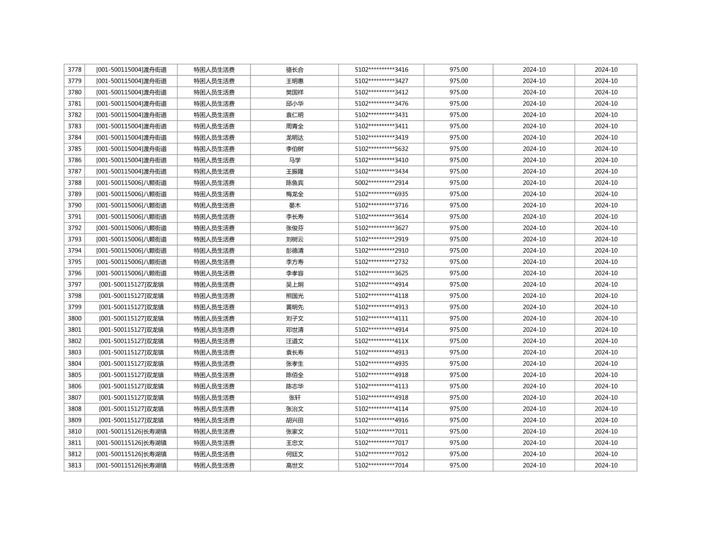 2024年10月重庆市长寿区特困救助供养资金发放情况