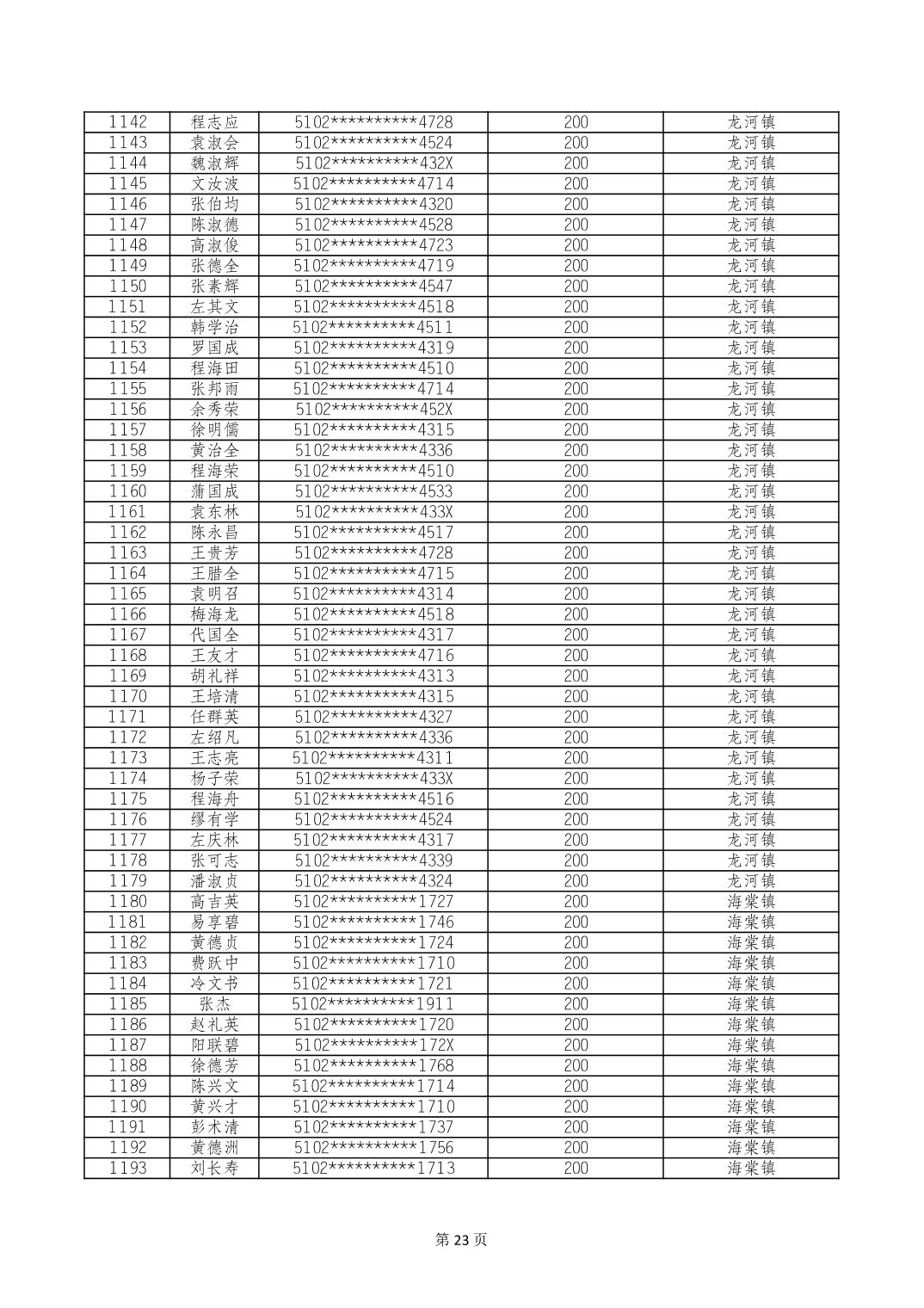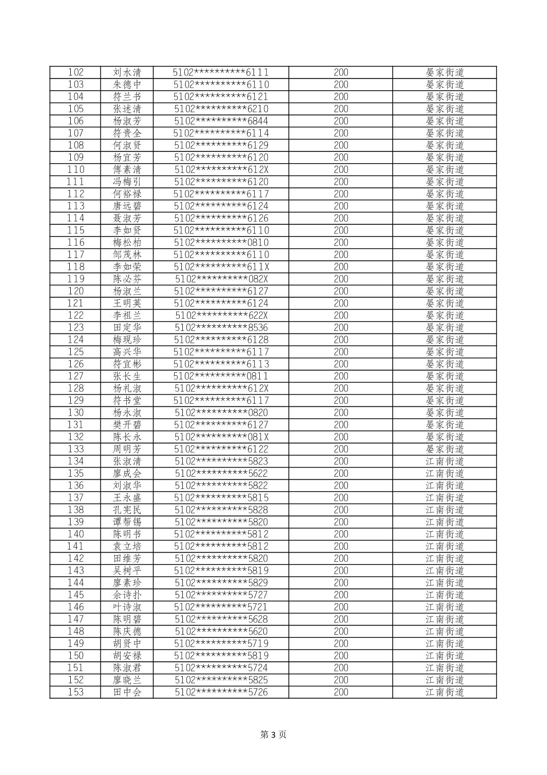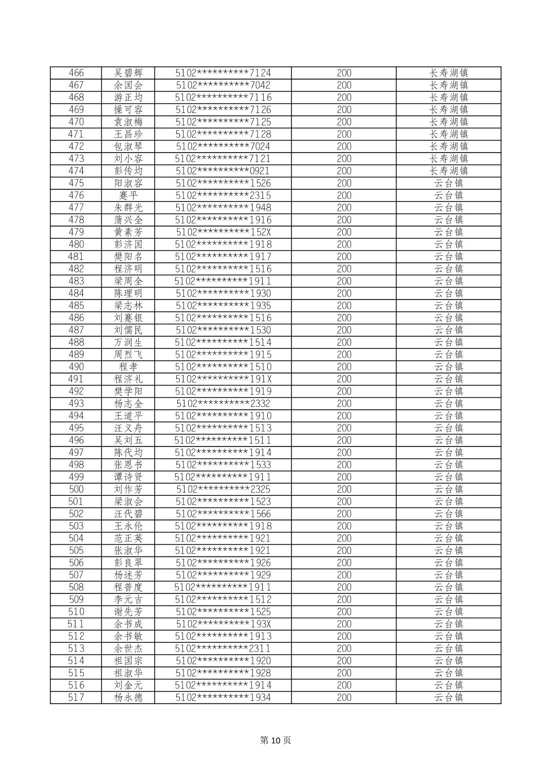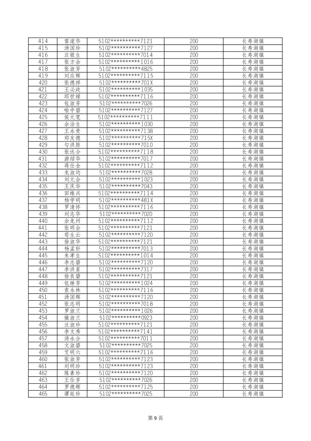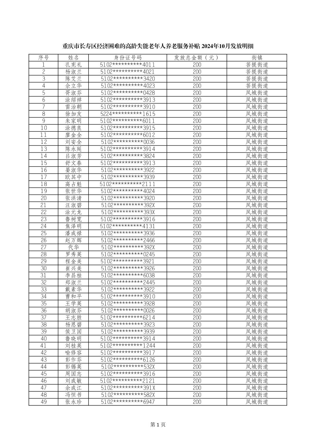 重庆市长寿区经济困难的高龄失能老年人养老服务补贴 2024年10月发放明细