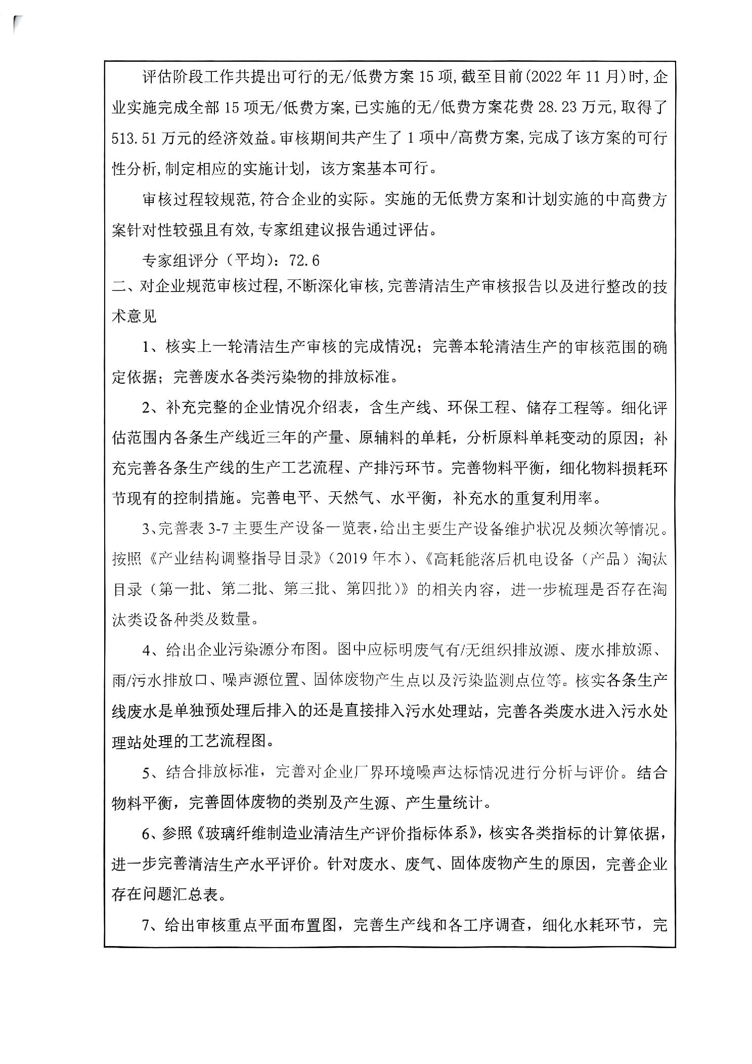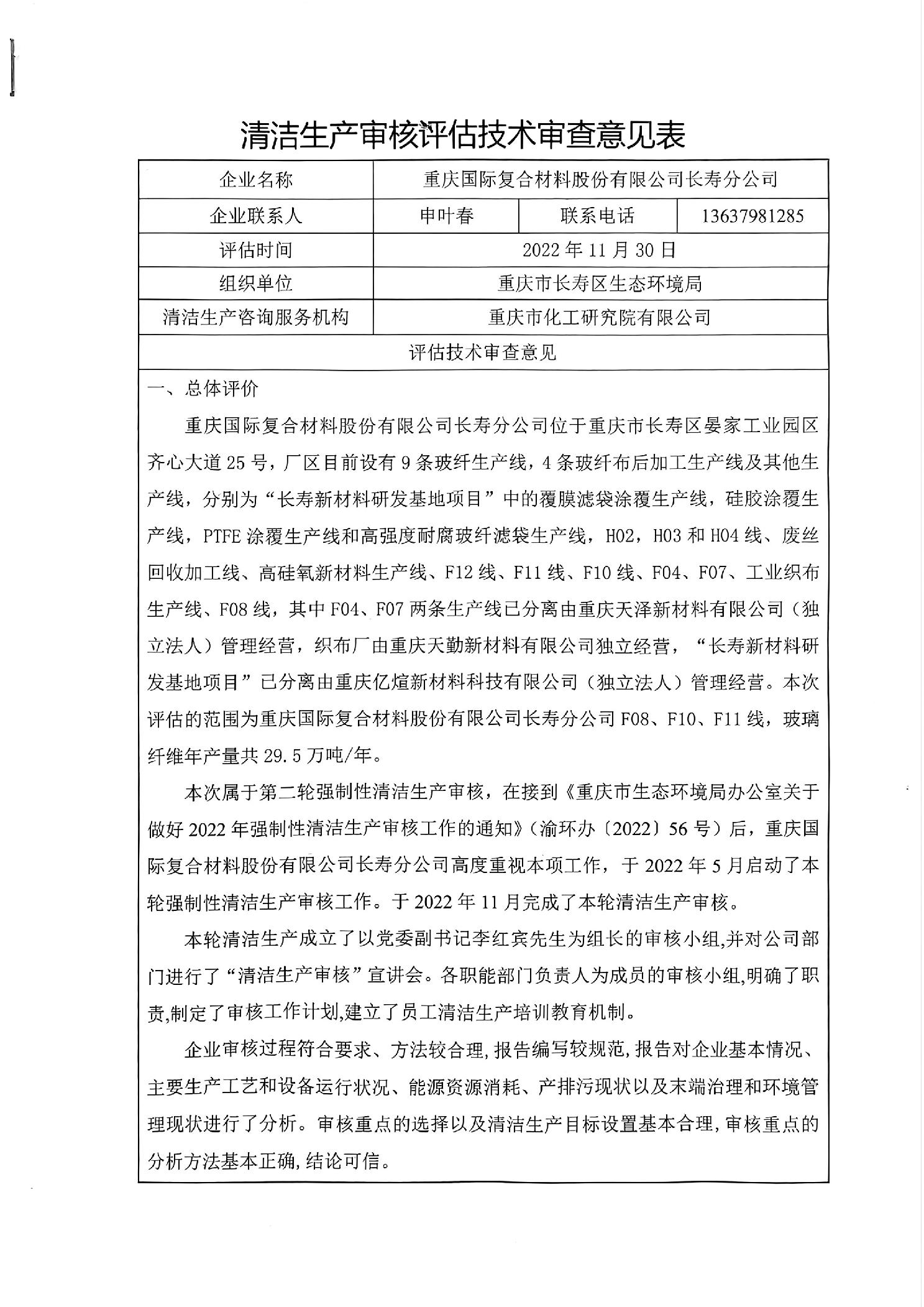 重庆国际复合材料股份有限公司长寿分公司清洁生产审核评估意见表
