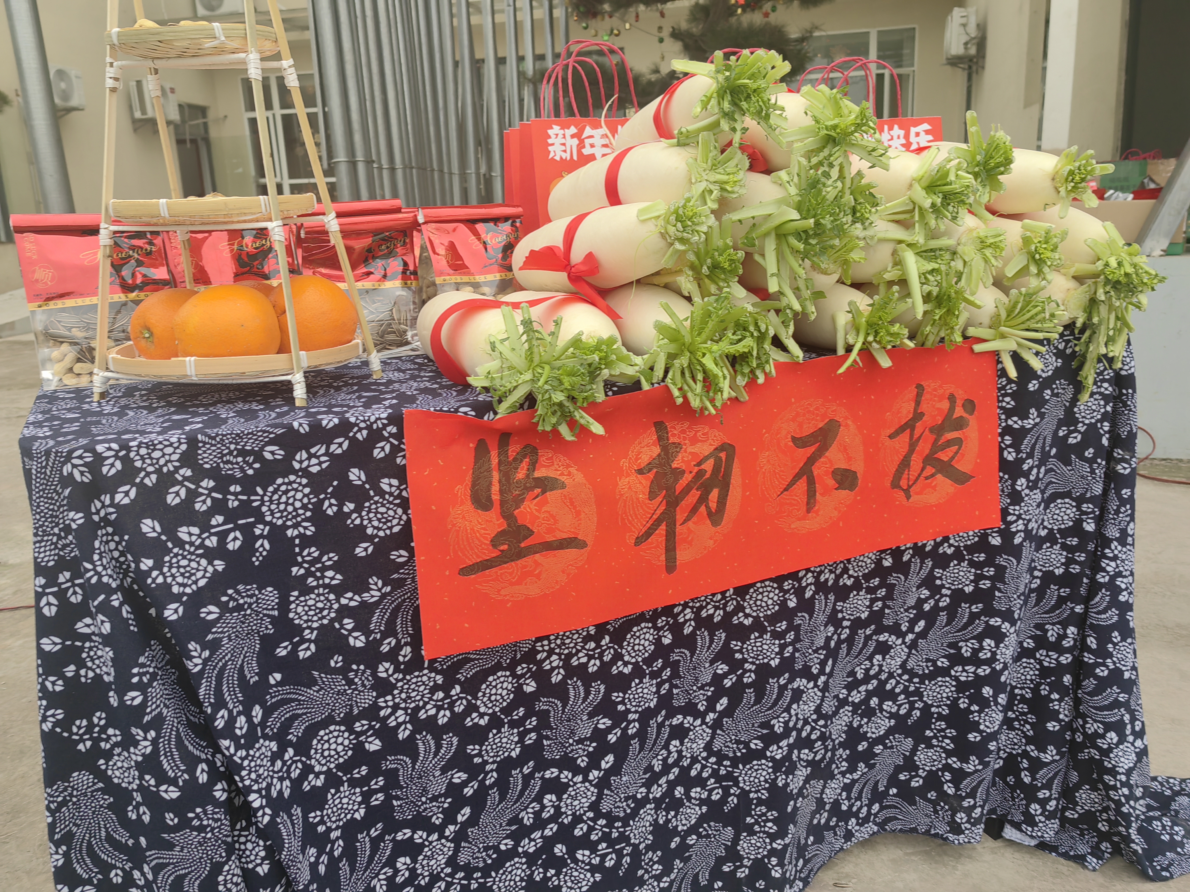运动会现场喜庆氛围浓厚,丰收主题装饰独具特色。竹编、红绸与甘蔗、萝卜相映成趣,系着红花的猪头、悬挂整齐的鲜肉既是亮眼布置,也是实用奖品,既勾勒出乡村丰收图景,更让赛事满溢质朴乡土气息。