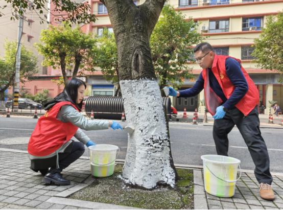活动现场,志愿者们手持毛刷、涂料桶等工具,分工协作、细致作业,按照树木涂白的规范要求,均匀涂抹生石灰混合液,为一棵棵行道树统一穿上“白色防护衣”。洁白整齐的涂白痕迹,不仅让冬日街景更显清爽整洁,更为树木筑牢了冬季防护屏障。