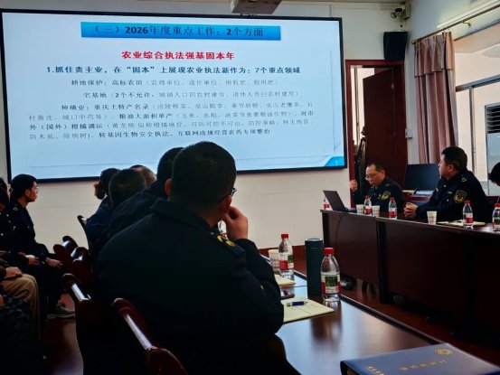 区农业综合行政执法支队还对2026年农资、畜牧兽医、农产品质量安全、长江“十年禁渔”等重点领域的执法监管工作作出具体安排,并围绕第一季度工作重点开展专题讨论,进一步明确工作思路、细化落实举措,为全年农业执法工作开好局、起好步奠定坚实基础。