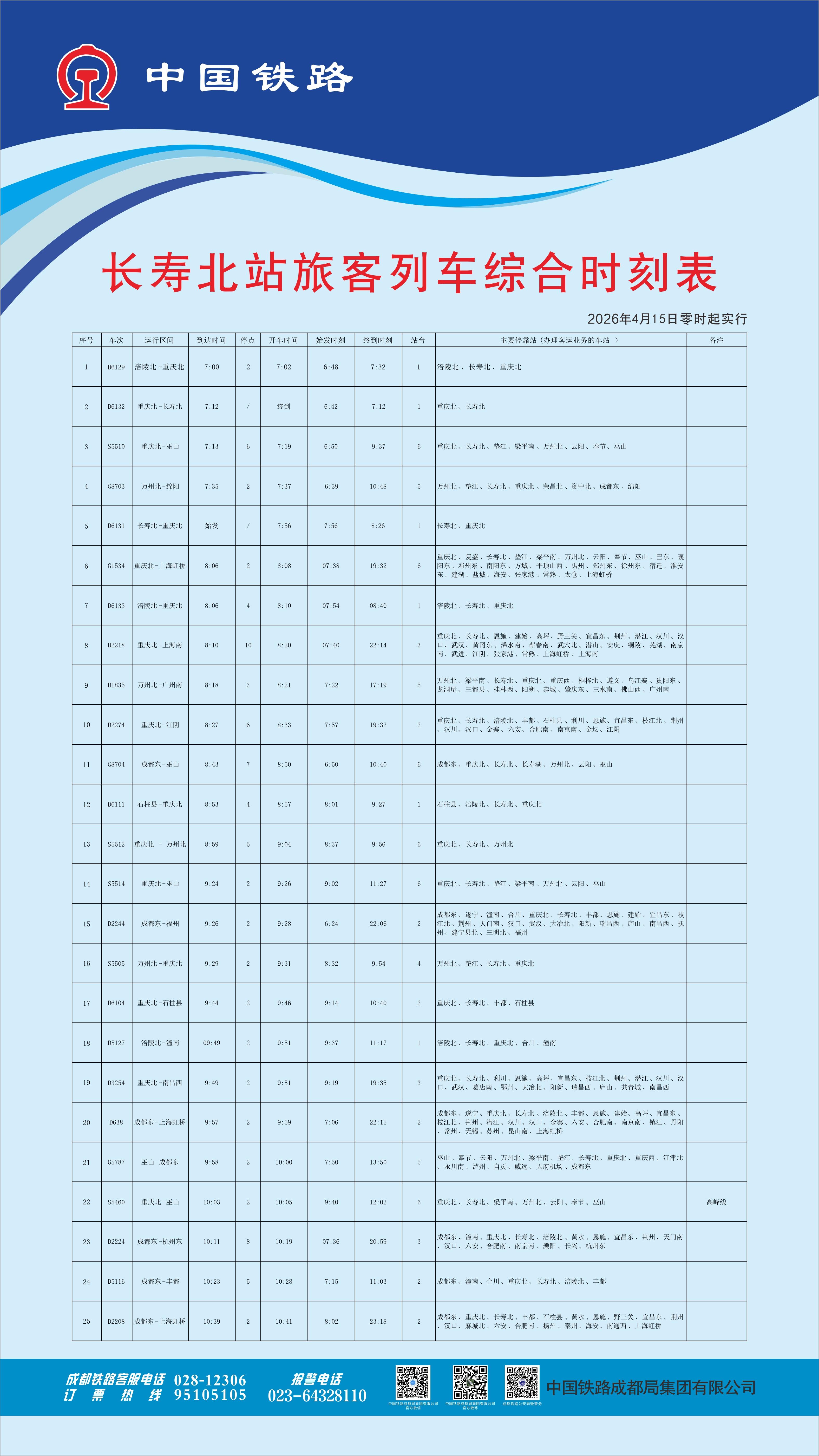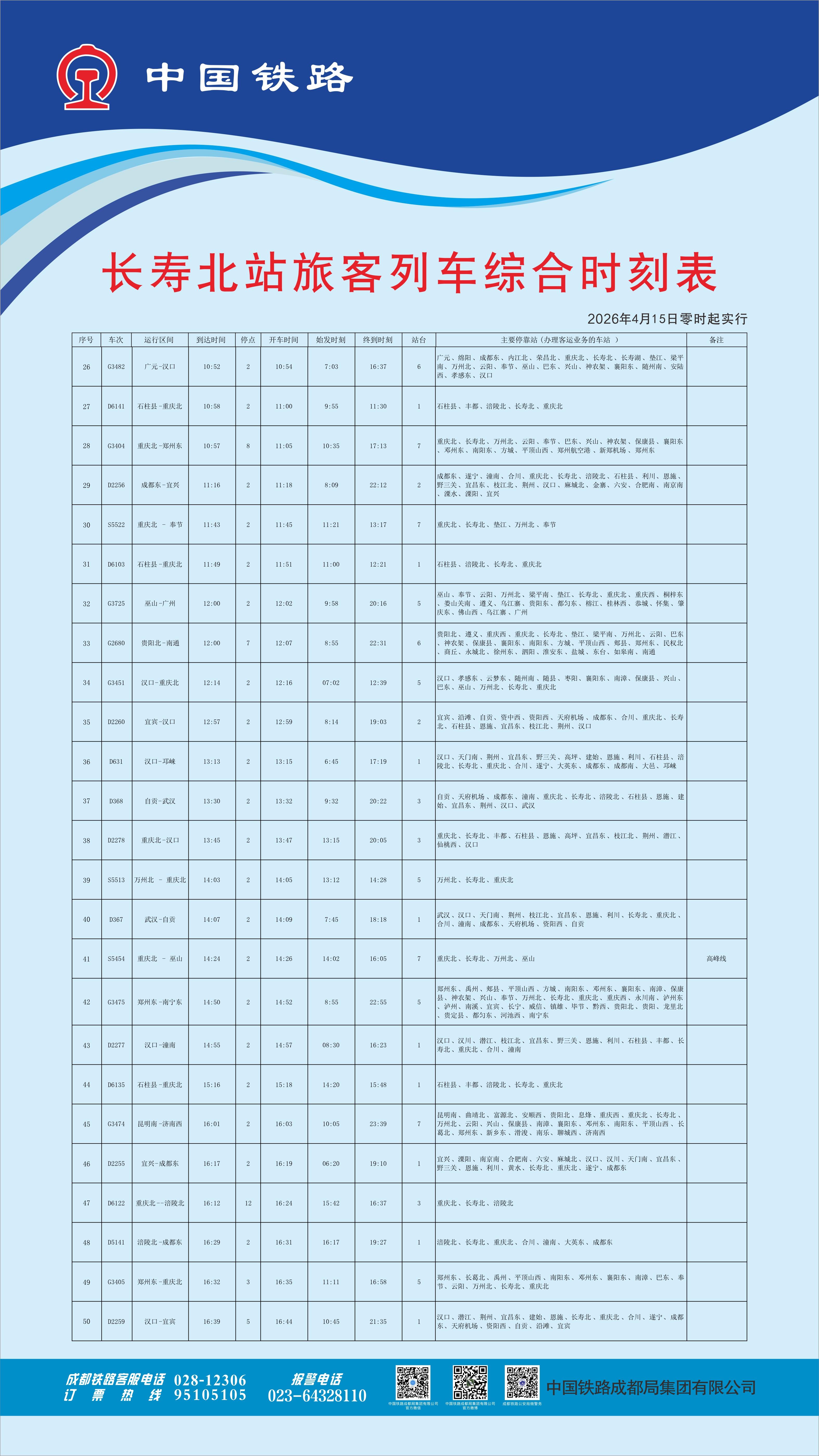 根据统一安排,从4月15日零时起,长寿北站将实行新的列车运行图,部分线路将有所调整。