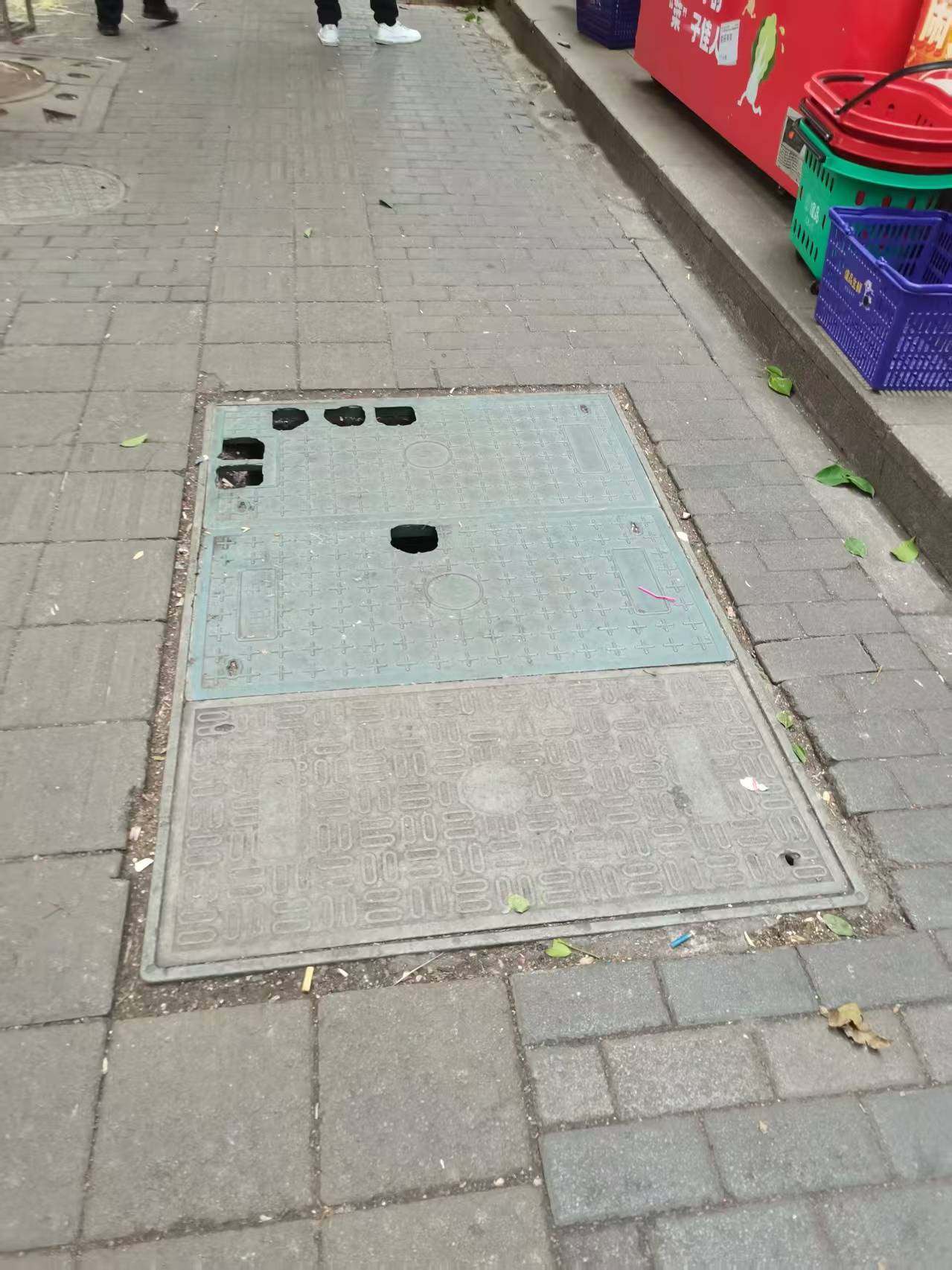 经我局日常巡查发现,位于长寿区新康璞山小区西门外面谊品生鲜超市门口(长洪路007灯杆处)的方形窨井盖存在多处破损的问题,对过往行人通行存在较大风险隐患。2026年2月4日,我局组织全区主要管线单位现场确认,暂无单位认领处置。